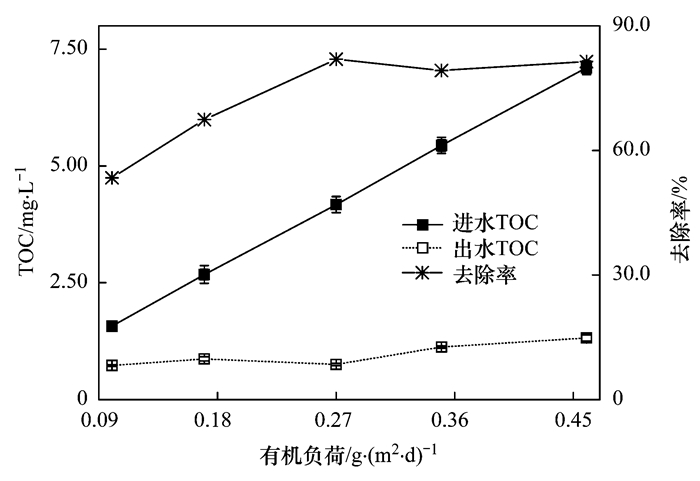 與生活污水不同,天然水體中的有機(jī)組分含量低,可生物降解性能相對(duì)較差.本研究通過向混凝前的水中投加不同濃度的乙酸鈉(難降解有機(jī)組分)調(diào)節(jié)系統(tǒng)的有機(jī)負(fù)荷,以期所得研究結(jié)果可與實(shí)際情況相吻合. 圖 3為不同有機(jī)負(fù)荷條件下,一體化生物凈化裝置對(duì)水中有機(jī)組分的去除效果.從中可知,隨著系統(tǒng)進(jìn)水有機(jī)負(fù)荷的增加,裝置處理出水中的TOC含量呈現(xiàn)一定程度的上升趨勢(shì),但絕對(duì)增加量并不顯著.當(dāng)系統(tǒng)有機(jī)負(fù)荷為0.1 g·(m2·d)-1時(shí),處理出水中有機(jī)組分的殘留量(以TOC計(jì),下同)為0.73 mg·L-1;當(dāng)有機(jī)負(fù)荷增至0.46 g·(m2·d)-1時(shí),有機(jī)組分的殘留量約為1.32 mg·L-1.這表明一體化生物凈化沉淀裝置對(duì)系統(tǒng)進(jìn)水中的有機(jī)組分負(fù)荷波動(dòng)具有一定的抗沖擊能力.這一性能從有機(jī)組分的去除率上觀察則更為明顯,即隨著系統(tǒng)進(jìn)水有機(jī)負(fù)荷的增加,TOC的去除率呈現(xiàn)明顯的上升趨勢(shì),由0.1 g·(m2·d)-1時(shí)的53.4%迅速增至82.0%,而后則相對(duì)穩(wěn)定.這表明當(dāng)進(jìn)水有機(jī)負(fù)荷在0.27 g·(m2·d)-1以上時(shí),系統(tǒng)的抗沖擊負(fù)荷能力開始出現(xiàn)下降.控制系統(tǒng)進(jìn)水有機(jī)負(fù)荷在0.27 g·(m2·d)-1以下,有利于保證有機(jī)組分去除的穩(wěn)定性.
