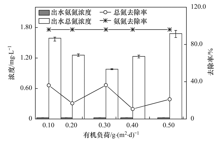 反硝化則主要是由異養(yǎng)菌在缺氧環(huán)境中完成的,以有機(jī)物為電子受體和營(yíng)養(yǎng)源,若有機(jī)組分含量不足,將抑制反硝化過程的進(jìn)行[23].由圖 5可知,裝置出水中的硝酸鹽氮濃度隨進(jìn)水有機(jī)負(fù)荷的變化出現(xiàn)一定波動(dòng).當(dāng)進(jìn)水有機(jī)負(fù)荷小于0.27 g·(m2·d)-1時(shí),出水中硝酸鹽氮的濃度與進(jìn)水有機(jī)負(fù)荷正相關(guān);而當(dāng)進(jìn)水有機(jī)負(fù)荷在0.27 g·(m2·d)-1以上時(shí),出水中的硝酸鹽氮濃度與進(jìn)水有機(jī)負(fù)荷呈現(xiàn)負(fù)相關(guān)關(guān)系.這可能是由于碳源投加量較少時(shí),反硝化菌與其他異養(yǎng)菌競(jìng)爭(zhēng)有限碳源時(shí)更具優(yōu)勢(shì)[7],隨著有機(jī)負(fù)荷的增加,系統(tǒng)中異養(yǎng)微生物生長(zhǎng)優(yōu)勢(shì)則強(qiáng)于反硝化細(xì)菌,使處理出水中的硝酸鹽氮含量上升.