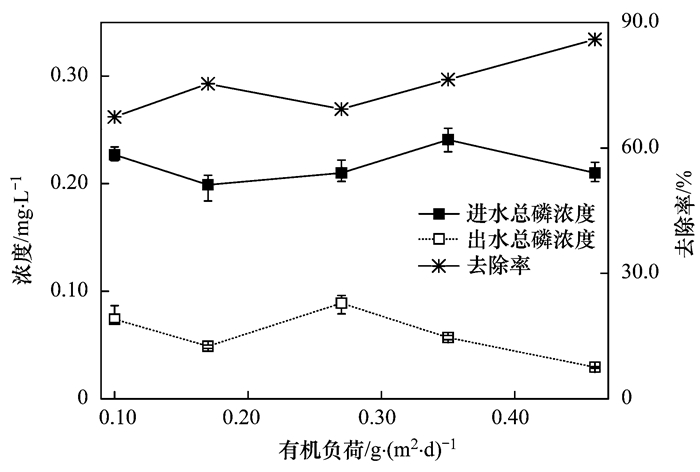 系統(tǒng)的除磷作用包括聚磷菌對(duì)磷的厭氧釋放和好氧吸收兩個(gè)過程.厭氧階段的釋磷過程有助于好氧階段對(duì)磷的過量吸收[24, 25],而在厭氧階段能否充分釋磷很大程度上取決于可供利用的有機(jī)物含量[23].因此,進(jìn)水有機(jī)負(fù)荷的變化對(duì)總磷在生物凈化沉淀裝置中的去除效率也將存在一定的影響.由圖 6可知,當(dāng)進(jìn)水有機(jī)負(fù)荷在0.27 g·(m2·d)-1以下時(shí),TP去除率相對(duì)穩(wěn)定,在67.4%~75.4%之間波動(dòng).而當(dāng)進(jìn)水有機(jī)負(fù)荷在0.27 g·(m2·d)-1以上時(shí),TP的去除率呈顯著增加趨勢(shì).當(dāng)進(jìn)水中有機(jī)負(fù)荷在0.46 g·(m2·d)-1時(shí),凈化出水中TP的殘留量約為0.029 mg·L-1,去除率在85.9%左右.對(duì)比相同條件下硝酸鹽氮的去除規(guī)律可知,反硝化菌和聚磷菌對(duì)有限碳源存在競(jìng)爭(zhēng)關(guān)系[26].進(jìn)水中有機(jī)組分含量的增加,提高了系統(tǒng)有機(jī)負(fù)荷,緩解了體系碳源不足的問題,進(jìn)而提升了裝置對(duì)磷的去除能力.這與劉方婧等[27]研究A2O工藝對(duì)磷的去除性能的結(jié)論基本一致.