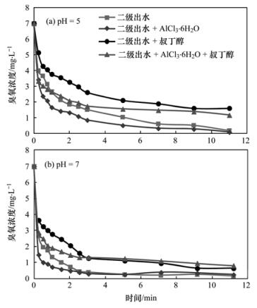 為探究混凝過(guò)程對(duì)臭氧衰減的促進(jìn)作用,選擇混凝劑AlCl3·6H2O和兩種pH進(jìn)行實(shí)驗(yàn).由圖 3可以看出,隨著pH的增加臭氧衰減速度加快.加入的混凝劑與臭氧接觸會(huì)顯著加快臭氧的消耗,這可能是由于混凝劑中的金屬離子在一定程度上對(duì)臭氧起到了催化氧化的作用,使其分解產(chǎn)生更多氧化性更強(qiáng)的·OH,加速了臭氧的衰減.臭氧在水中的分解是由于臭氧與水中的氫氧根(OH-)反應(yīng)[39],導(dǎo)致超氧自由基(·O2-)的形成,隨后引發(fā)鏈?zhǔn)椒磻?yīng)產(chǎn)生·OH[40].因此,pH越大,臭氧衰減速度越快.