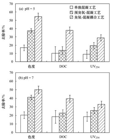 (2) 臭氧-混凝耦合工藝相比于傳統(tǒng)的預(yù)臭氧-混凝工藝,對(duì)色度、UV254和DOC有較好的去除效果.在不同pH條件下,AlCl3·6H2O作為混凝劑時(shí),耦合工藝對(duì)DOC的去除率均高于30%,說(shuō)明耦合工藝能夠有效提高溶解性有機(jī)物的去除效率.