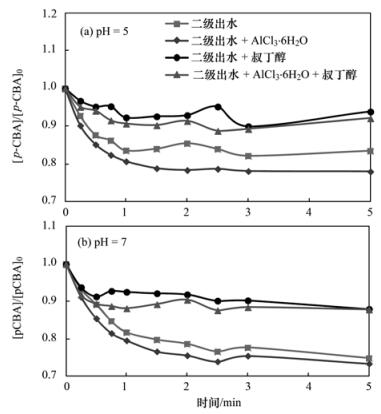 p-CBA的去除效果可以間接反映·OH的產(chǎn)生情況. 圖 4反映了加入叔丁醇和不加叔丁醇兩種情況下p-CBA的去除情況.可以看出加入的叔丁醇明顯降低了p-CBA的去除效率,說(shuō)明產(chǎn)生的大部分·OH被叔丁醇抑制了[46].隨著pH的升高,p-CBA的去除效率逐漸增大,說(shuō)明產(chǎn)生了較多的·OH.已有研究[47, 48]也證明高的pH可以促進(jìn)臭氧反應(yīng)產(chǎn)生更多的·OH.加入混凝劑可以提高p-CBA的去除效率,這意味著混凝劑和臭氧發(fā)生催化氧化產(chǎn)生了更多的·OH.在IOD階段(t<15s),p-CBA出現(xiàn)了明顯的減少,去除率在26%~40%之間,說(shuō)明大量的·OH產(chǎn)生在這一階段,特別在較高的pH條件時(shí).大量的研究[43, 44, 49]均證明IOD階段·OH的暴露量較高,并且迅速與有機(jī)物反應(yīng)而被消耗.