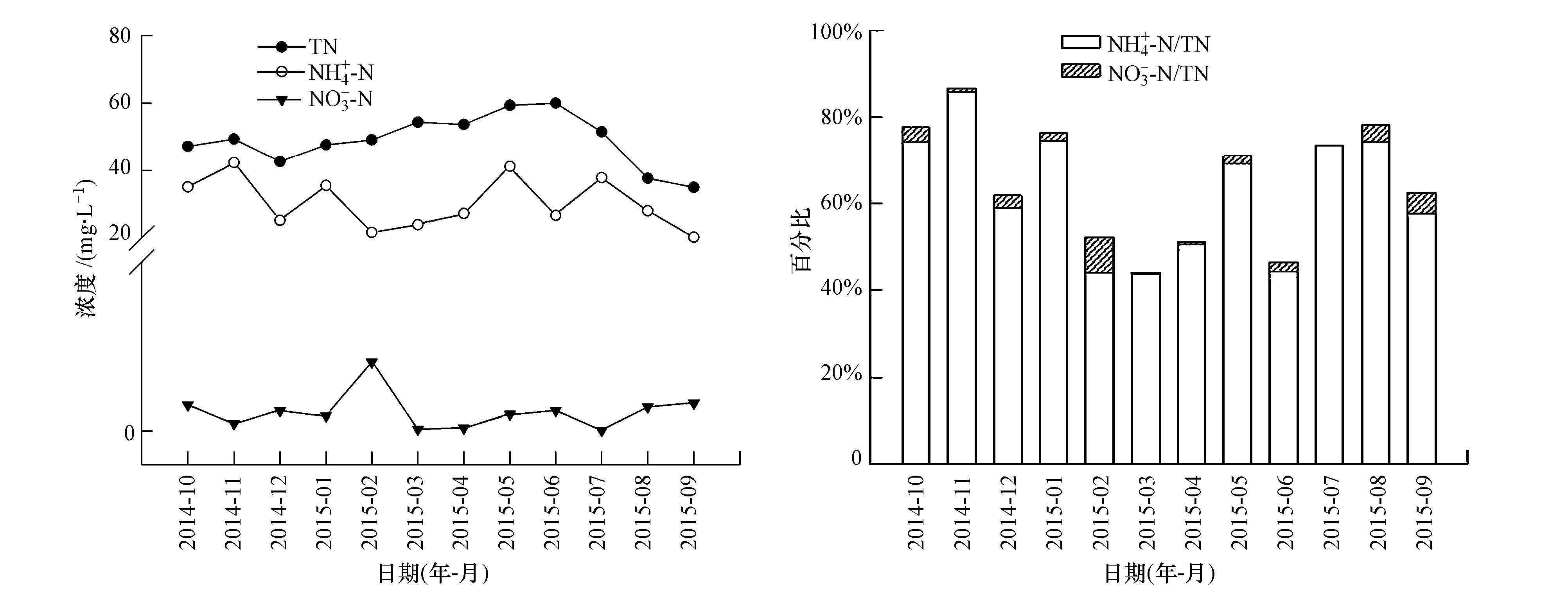 城市污水氮濃度以污水處理廠的進(jìn)水氮濃度表示,如圖 1所示,城市污水各形態(tài)氮表現(xiàn)出較為明顯的月變化特征.其中,城市污水中TN、NH4+-N濃度高且隨時間變化趨勢顯著;而NO3--N濃度較低,變化趨勢波動不明顯.TN濃度1年內(nèi)的變化范圍為34.975~59.987 mg·L4-1,每月平均值為48.947 mg·L-1,在2015年6月達(dá)到峰值;NH4+-N濃度1年內(nèi)的變化范圍為20.185~42.303 mg·L-1,每月平均值為30.395 mg·L-1.多月的濃度數(shù)據(jù)顯示,NH4+-N、NO3--N分別占TN的43.92%~85.72%和0.06%~8.31%,其中,NH4+-N的比例從2014年10月至2015年9月有較明顯的逐漸遞減后又逐漸遞增的趨勢.NH4+-N為城市污水氮污染物的主要成分.