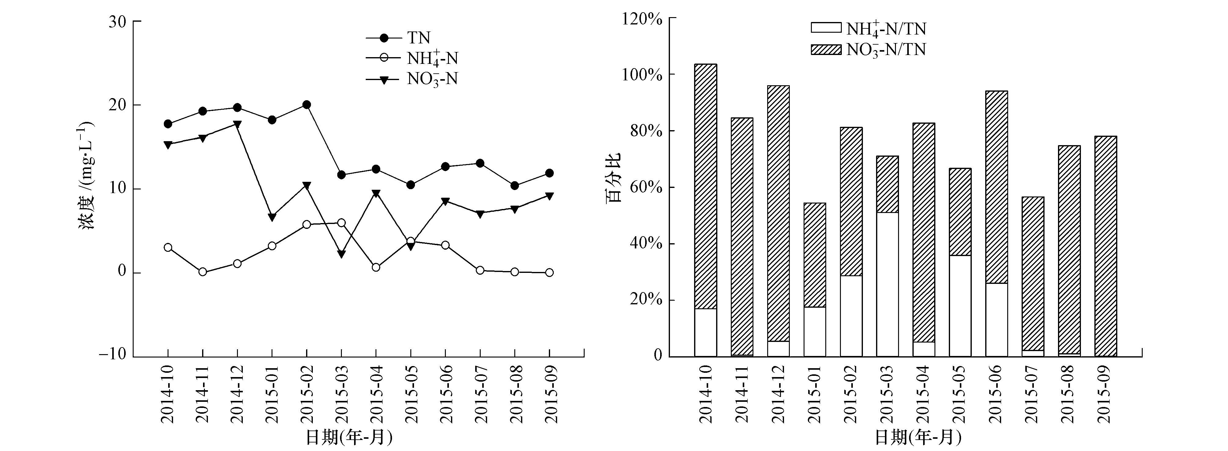 1) 2014—2015年北京市海淀區(qū)城市污水氮濃度具有顯著的月變化特征,未處理的城市污水TN濃度較高,變化范圍為34.975~59.987 mg·L-1,平均值為48.947 mg·L-1,NH4+-N是城市污水氮主要的存在形式.處理尾水中TN變化范圍在10.395~20.041 mg·L-1之間,NO3--N為主要的氮形式.