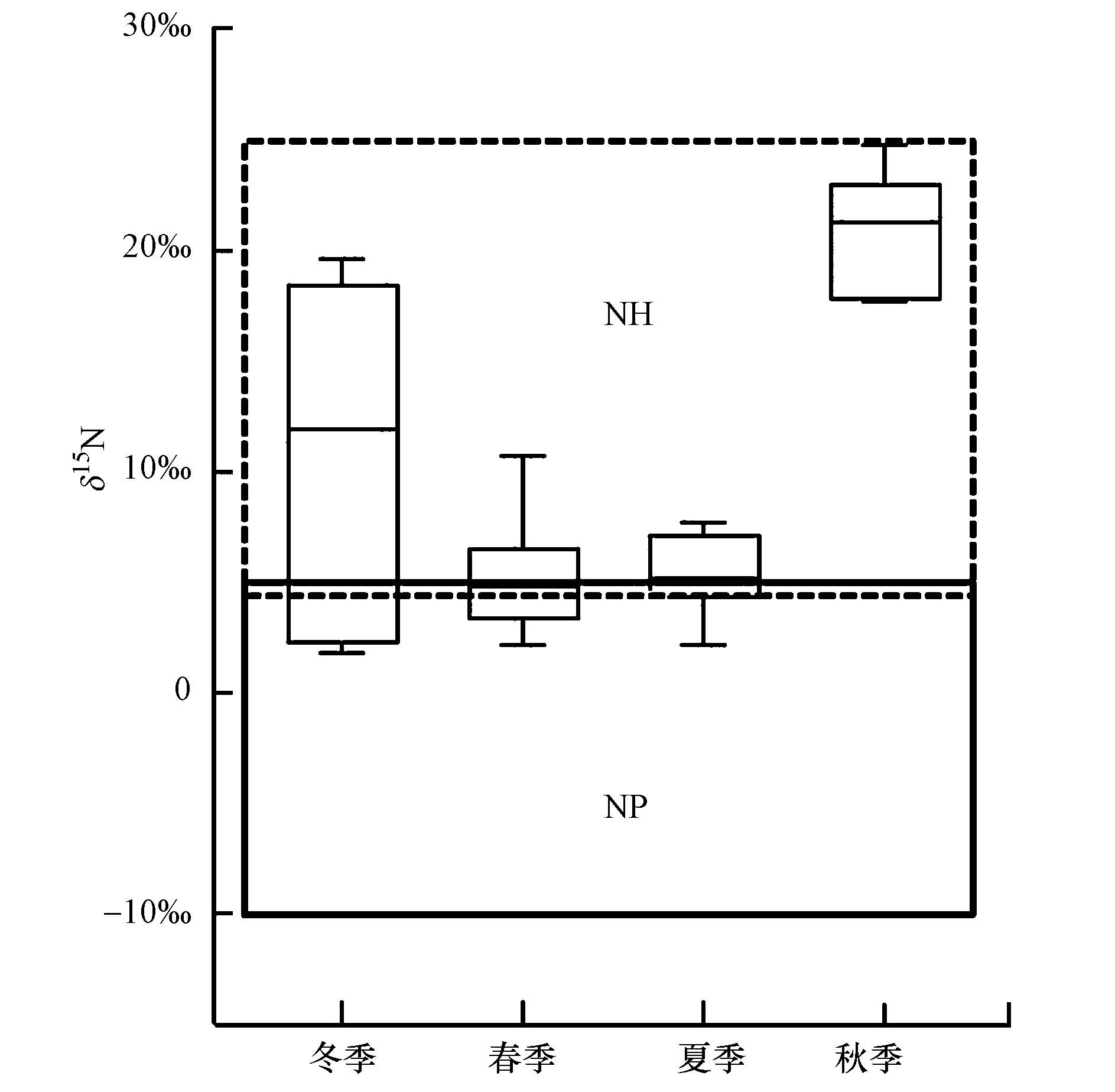 圖 6各季節(jié)城市污水δ15N值對比(方框表示不同來源的同位素值,其中,NP表示降水來源氮同位素范圍值,NH表示人類排泄物氮同位素范圍值)