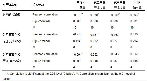 為了定量分析水劣化足跡與所選城市發(fā)展指標(biāo)之間的相關(guān)關(guān)系, 運(yùn)用SPSS數(shù)據(jù)分析軟件, 分別對(duì)水體酸化足跡、水體富營(yíng)養(yǎng)化足跡及以上4個(gè)指標(biāo)進(jìn)行相關(guān)性分析.其中由于水體富營(yíng)養(yǎng)化足跡的跳躍性變化, 相關(guān)性分析也分別針對(duì)兩個(gè)階段展開(kāi), 分析結(jié)果如表 3所示.
