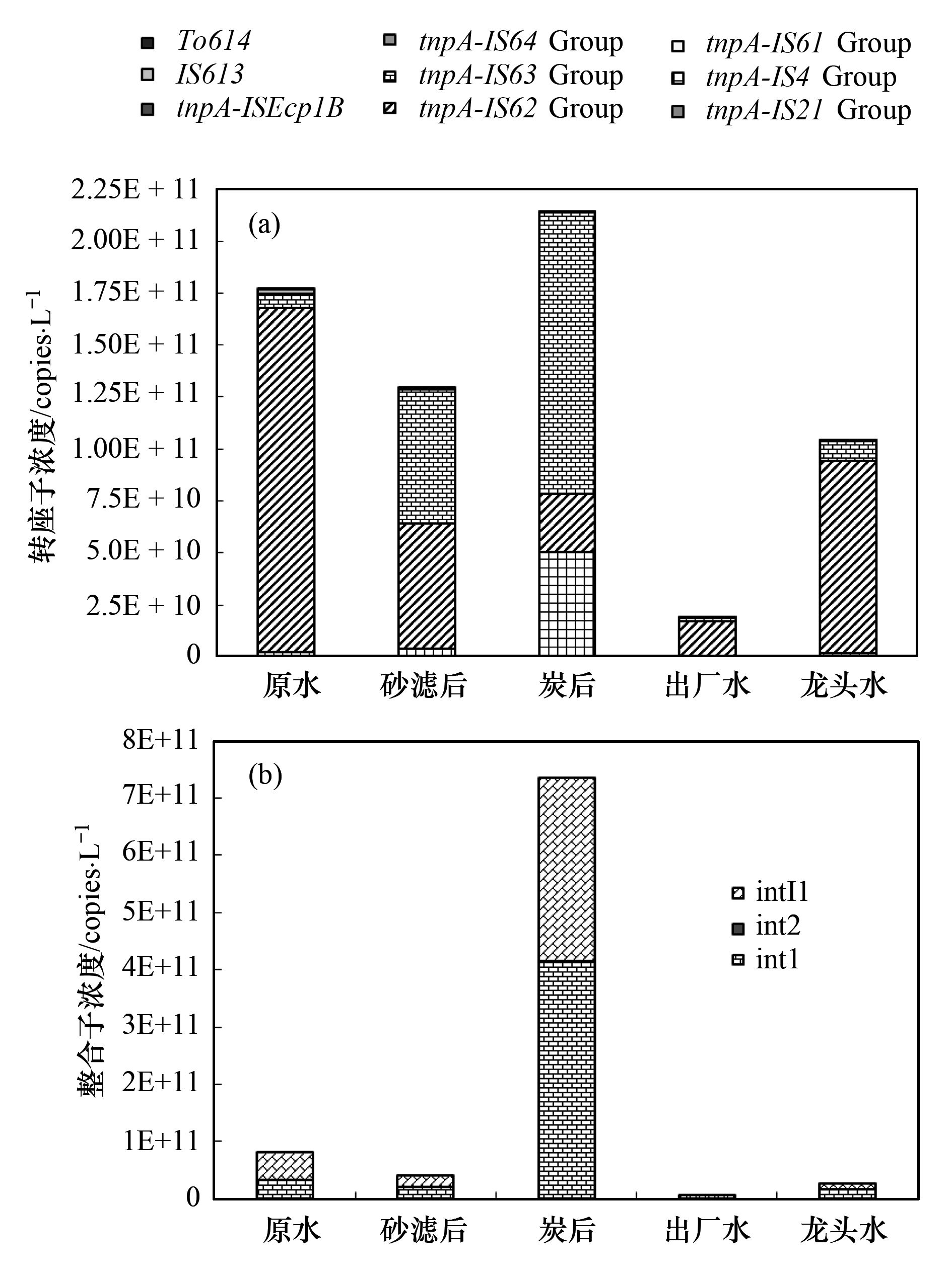 圖 4為可移動(dòng)基因元件(轉(zhuǎn)座子和整合子基因)在凈水工藝中的絕對(duì)濃度變化規(guī)律. 本研究中各工藝單元出水的轉(zhuǎn)座子絕對(duì)濃度變化規(guī)律為: 生物活性炭濾池>原水>砂濾后>龍頭水>水廠出水[圖 4(a)],經(jīng)過生物活性炭濾池后可移動(dòng)基因元件絕對(duì)濃度有明顯增加,由1.29E+11 copies·L-1增加至2.14E+11 copies·L-1,其絕對(duì)濃度超過原水. 整合子絕對(duì)濃度變化規(guī)律為: 生物活性炭>原水>砂濾后>龍頭水>水廠出水[圖 4(b)],經(jīng)過生物活性炭濾池后可移動(dòng)基因元件絕對(duì)濃度有明顯增加,由4.00E+10 copies·L-1增加至7.35E+11 copies·L-1.