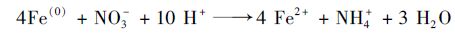 因此,在硫鐵復(fù)合填料體系中,海綿鐵腐蝕生成Fe2+、 Fe3+、 FeOOH和FeS是實(shí)現(xiàn)高效除磷的主要原因. 系統(tǒng)中海綿鐵的腐蝕途徑包括: ①單質(zhì)鐵被水中的溶解氧氧化為Fe3O4和Fe2O3等物質(zhì); ②海綿鐵內(nèi)部的碳與鐵構(gòu)成微原電池持續(xù)促進(jìn)海綿鐵腐蝕產(chǎn)生Fe2+,如反應(yīng)方程式(1)、 (2)所示; ③零價(jià)鐵與硝酸鹽發(fā)生氧化還原反應(yīng)生成Fe2+[11~13],如反應(yīng)方程式(3)、 (4)所示,出水NO2--N、 NH4+-N濃度見圖 5; ④硫鐵填料之間的硫化反應(yīng)又進(jìn)一步促進(jìn)海綿鐵的腐蝕.