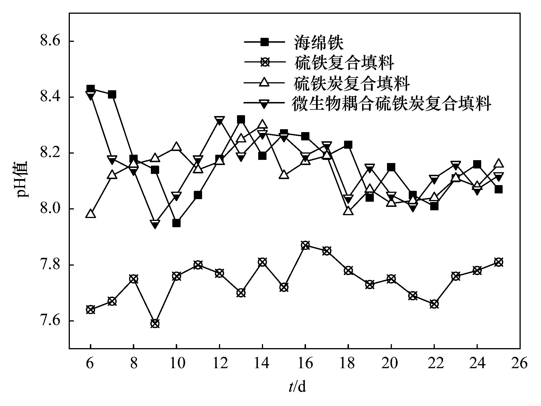 系統(tǒng)除磷過程包括: ①疏松多孔的海綿鐵先通過物理化學(xué)吸附作用將PO43-吸附其表面,在海綿鐵表面的還原性環(huán)境下,再與Fe2+作用形成Fe3(PO4)2·8H2O,最終轉(zhuǎn)化為穩(wěn)定態(tài)的Fe4(PO4)3(OH)3沉淀; ②不同類型填料出水pH值如圖 6所示,在偏堿性條件下,水中海綿鐵腐蝕生成的Fe2+很快轉(zhuǎn)化為Fe3+,F(xiàn)e2+的水解產(chǎn)物Fe(OH)2(Ksp=4.8×10-17)轉(zhuǎn)化為更難溶的Fe(OH)3(Ksp=2.79×10-39),水中富含有NO3-、 SO42-時(shí),F(xiàn)e3+水解產(chǎn)物Fe(OH)3膠體可以轉(zhuǎn)化成為FeOOH,有研究發(fā)現(xiàn),F(xiàn)eOOH對(duì)PO43-有很強(qiáng)的吸附作用,PO43-與FeOOH作用生成多核羥基磷酸鐵沉淀; ③由于硫磺的氧化還原電位高于鐵的[φθ(S/S2-)=0.48 V,φθ(Fe2+/Fe)=-0.44 V,而且形成FeS或FePO4沉淀致使φθ(Fe2+/Fe)、 φθ(Fe3+/Fe)氧化還原電位降低、 φθ(S/S2-)氧化還原電位升高,進(jìn)一步促進(jìn)硫磺與海綿鐵反應(yīng)生成FeS,新生成的FeS具有較強(qiáng)活性、 較大的比表面積和吸附容量,F(xiàn)eS先將PO43-吸附在其表面,由于FeS的溶度積(Ksp=6.3×10-18)大于FePO4的溶度積(Ksp=1.3×10-22),F(xiàn)eS轉(zhuǎn)化為更難溶的FePO4沉淀. 可見,硫鐵復(fù)合填料體系以吸附沉淀方式將水中的磷去除.