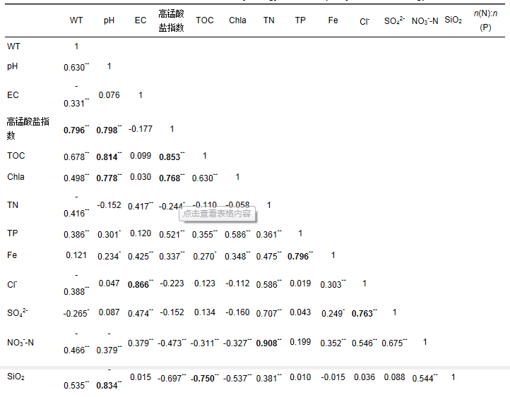 湯浦水庫水文和水環(huán)境變量2011年均值和變化范圍見表 1.各變量Pearson相關(guān)系數(shù)矩陣見表 2(其中僅列舉至少有1個與其他變量的相關(guān)系數(shù)≥0.750的變量).其中,WT與除Fe外的其他因子顯著相關(guān),與高錳酸鹽指數(shù)相關(guān)性最高,二者峰值出現(xiàn)在8月(最高)和2月(最低);pH與高錳酸鹽指數(shù)、TOC和Chla顯著正相關(guān),三者最高值集中出現(xiàn)在5月、7月和8月,pH還與SiO2顯著負(fù)相關(guān);除了WT和pH外,高錳酸鹽指數(shù)還與TOC和Chla呈顯著正相關(guān);Cl-與電導(dǎo)率和SO42-顯著正相關(guān),三者在上半年明顯高于下半年;TN與NO3--N顯著強(qiáng)相關(guān);TP與Fe顯著正相關(guān),與N:P顯著負(fù)相關(guān).