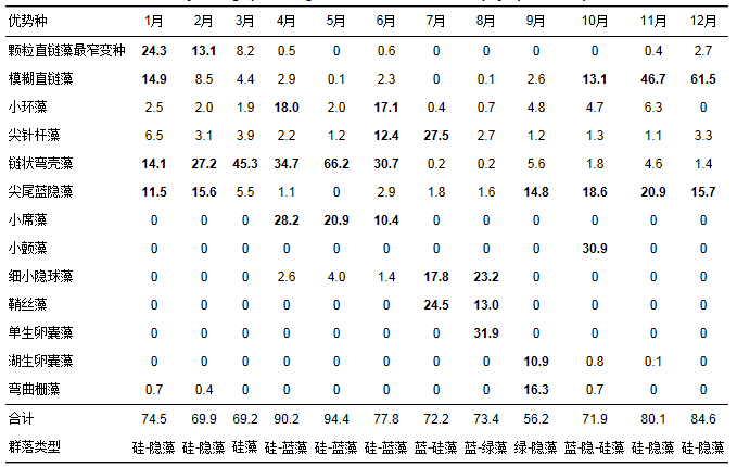 表 3 浮游植物優(yōu)勢種月度平均百分比豐度1)/%