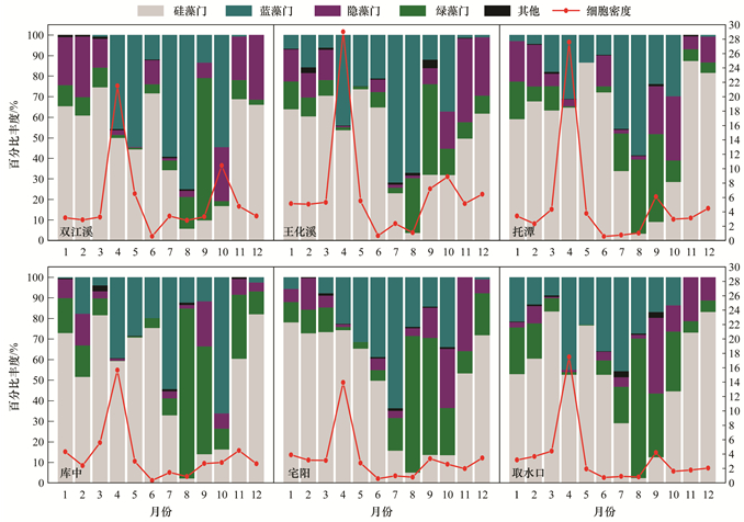 從浮游植物相對豐度(圖 2)來看,湯浦水庫占主導(dǎo)地位的是硅藻門、藍(lán)藻門、綠藻門和隱藻門,其他3門(裸藻門、金藻門和甲藻門)合計(jì)所占比例均 < 5%.與浮游植物密度類似,各采樣點(diǎn)的浮游植物門類組成具有較相似的時間變化:硅藻門在1~6月、11和12月占較高比例,相對豐度為44.4%~87.4%,僅處于水庫上游的雙江溪5月和王化溪11月低于50%;藍(lán)藻門在4~10月占較高比例,平均相對豐度為13.6%~58.9%;綠藻門在8月和9月占較高比例,平均相對豐度分別為51.8%和50.7%;隱藻門在1~2月和9~12月平均相對豐度為11.4%~25.3%.