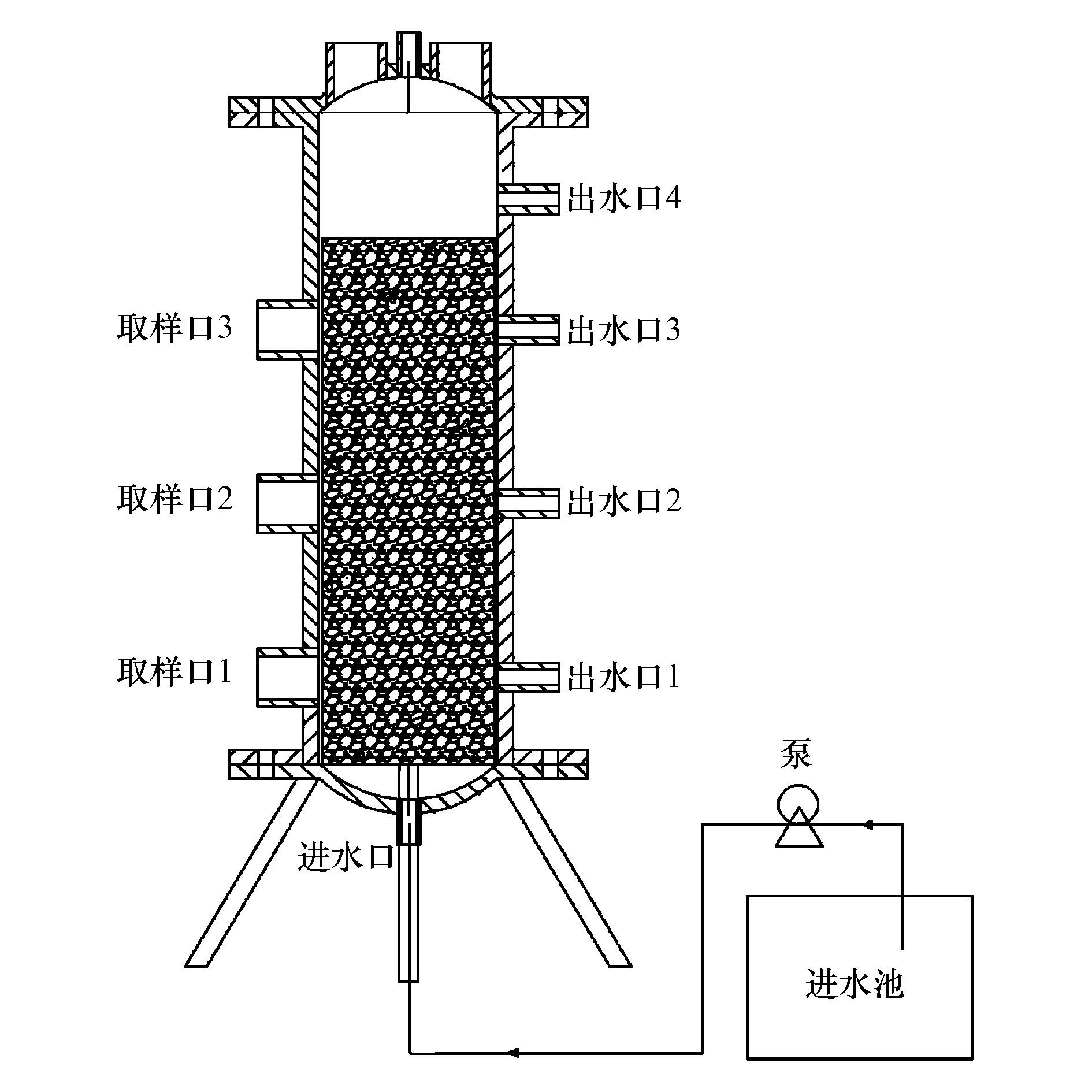 本實驗所用硫自養(yǎng)ClO4-還原反應器為升流式固定床反應器,圖 1為實驗裝置. 反應器內(nèi)徑為10 cm,有效高度為45 cm,材質為有機玻璃. 反應器內(nèi)填充載體為硫單質和石英砂(V硫:V砂=2:1),裝填體積為3.6 L. 硫顆粒和石英砂粒徑均為2~3 mm,反應器內(nèi)孔隙率為0.4,反應器有4個不同高度的出水口,分別為出水口1(60 mm),出水口2(180 mm),出水口3(300 mm),出水口4(390 mm),菌群結構分析所取泥樣分別來自取樣口1(60 mm)和取樣口3(300 mm).