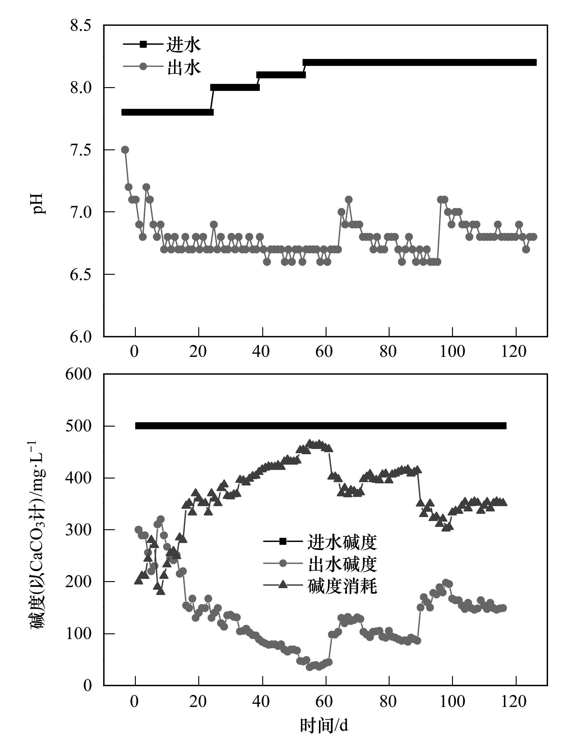 圖 3 硫自養(yǎng)反應器中pH及堿度的變化