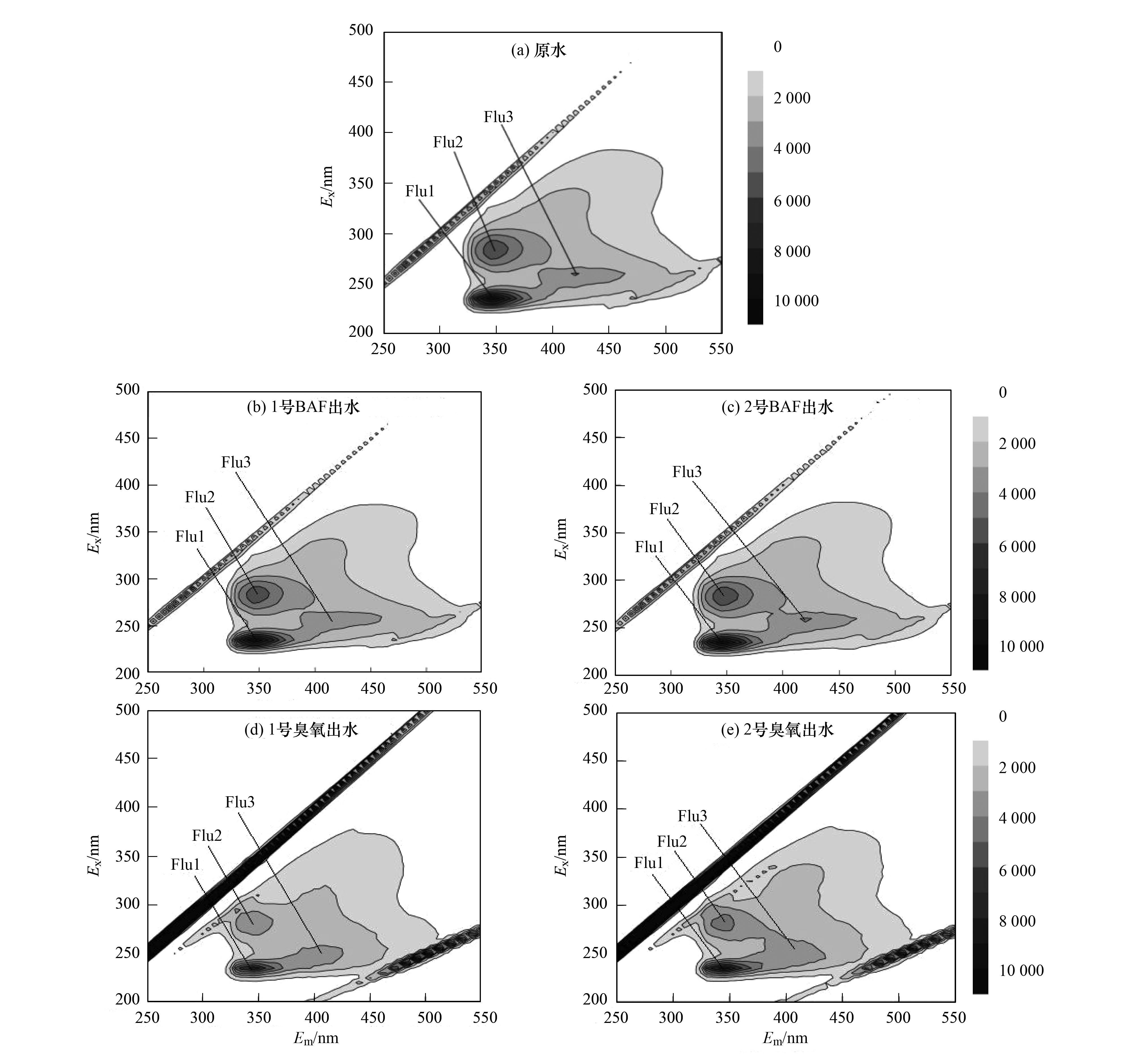 石化二級(jí)出水、 1號(hào)、 2號(hào)工藝各段出水中溶解性有機(jī)物三維熒光光譜如圖 5所示,其主要熒光峰有3個(gè),其中,F(xiàn)lu1為色氨酸類芳香族蛋白質(zhì)熒光峰; Flu2 為類溶解性微生物代謝產(chǎn)物熒光峰; Flu3為類腐殖酸的熒光峰. 通過(guò)進(jìn)一步分析三維熒光光譜的數(shù)據(jù)矩陣,得到各熒光峰的位置及對(duì)應(yīng)的熒光強(qiáng)度(FI)見(jiàn)表 1. Flu4表征水樣中總熒光峰,其熒光強(qiáng)度是水樣中Flu1~Flu3熒光峰的熒光強(qiáng)度之和. 石化二級(jí)出水經(jīng)過(guò)2號(hào)工藝BAF處理后各熒光峰強(qiáng)度提高,這是因?yàn)橐恍┤芙庑晕⑸锎x產(chǎn)物例如多糖、 蛋白、 腐殖質(zhì)物質(zhì)在BAF處理中產(chǎn)生,而這些物質(zhì)均有一定的熒光性. 加鐵鹽的1號(hào)BAF出水總熒光峰Flu4強(qiáng)度比石化二級(jí)出水略低,這是由于鐵元素是微生物所需的微量元素,一定量的FeSO4·7H2O可促進(jìn)微生物代謝,增強(qiáng)微生物活性,導(dǎo)致BAF生化作用增強(qiáng),而類溶解性微生物代謝產(chǎn)物和類腐殖質(zhì)均屬于生化性較強(qiáng)的物質(zhì),更容易被BAF去除,所以Flu2和Flu3的熒光峰強(qiáng)度較石化二級(jí)出水均有降低. 然而Flu1的熒光峰強(qiáng)度較石化二級(jí)出水升高,首先因?yàn)槭瘡U水中所含的有機(jī)物多以苯環(huán)剛性結(jié)構(gòu)有機(jī)物、 π—π共軛雙鍵的不飽和有機(jī)物為主,BAF工藝并不能夠有效去除毒性較大的類芳香族蛋白質(zhì),其次BAF生化反應(yīng)產(chǎn)生的微生物次生代謝產(chǎn)物具有一定熒光性,從而導(dǎo)致Flu1熒光峰強(qiáng)度升高. 兩組工藝的臭氧段出水中,F(xiàn)lu1、 Flu2、 Flu3的熒光峰強(qiáng)度均有明顯的降低,而且Flu3藍(lán)移了5~10 nm. 藍(lán)移主要是由大分子有機(jī)物分解為小分子有機(jī)物或者稠環(huán)芳香烴的多環(huán)結(jié)構(gòu)分解破壞引起的. 從本研究結(jié)果來(lái)看,由于O3的強(qiáng)氧化性,將難降解有機(jī)物大分子氧化為小分子物質(zhì),將稠環(huán)芳烴的多環(huán)結(jié)構(gòu)及共軛雙鍵破壞,導(dǎo)致各類熒光峰強(qiáng)度的降低以及Flu3的藍(lán)移. 其中1號(hào)臭氧段出水熒光峰強(qiáng)度明顯低于2號(hào)臭氧段出水,這是由于進(jìn)水中鐵離子對(duì)臭氧催化,產(chǎn)生氧化性更強(qiáng)的·OH,提高了對(duì)有機(jī)物的氧化去除能力. 因此投加鐵鹽能夠強(qiáng)化BAF-臭氧組合工藝對(duì)石化污水廠二級(jí)出水的處理效果.