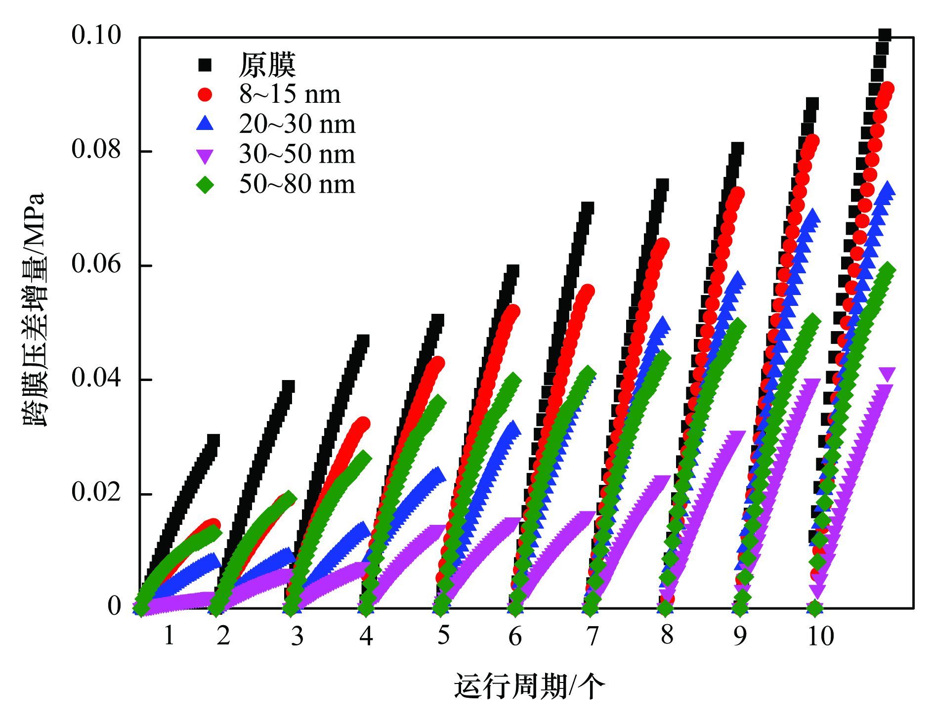CNTs尺寸對改性膜的抗污染性能的影響如圖 4所示. CNTs的乙醇分散液濃度為50%,超聲時間25 min,負載量3g·m-2,CNTs的尺寸分別為8~15、 20~30、 30~50以及50~80 nm. 研究結(jié)果表明,不同尺寸CNTs制備的改性膜的抗污染能力均強于未改性膜. 對于改性膜而言,過濾初期(前2個周期)各改性膜TMP均增長緩慢,各改性膜TMP增量均小于0.02 MPa. 隨著過濾的進行,各改性膜TMP增量逐漸增加且增長趨勢明顯,但CNTs尺寸與TMP增量間并未表現(xiàn)出明顯規(guī)律. 運行至第10周期,過濾5 L水樣后,各改性膜組件間TMP增幅已表現(xiàn)出明顯差異,其中,利用30~50 nm制備的改性膜TMP增幅最小,為0.043 MPa; 利用8~15 nm制備的改性膜TMP增幅最大,為0.09 MPa; 利用20~30 nm和50~80 nm制備的改性膜TMP增幅分別為0.072 MPa和0.059 MPa.