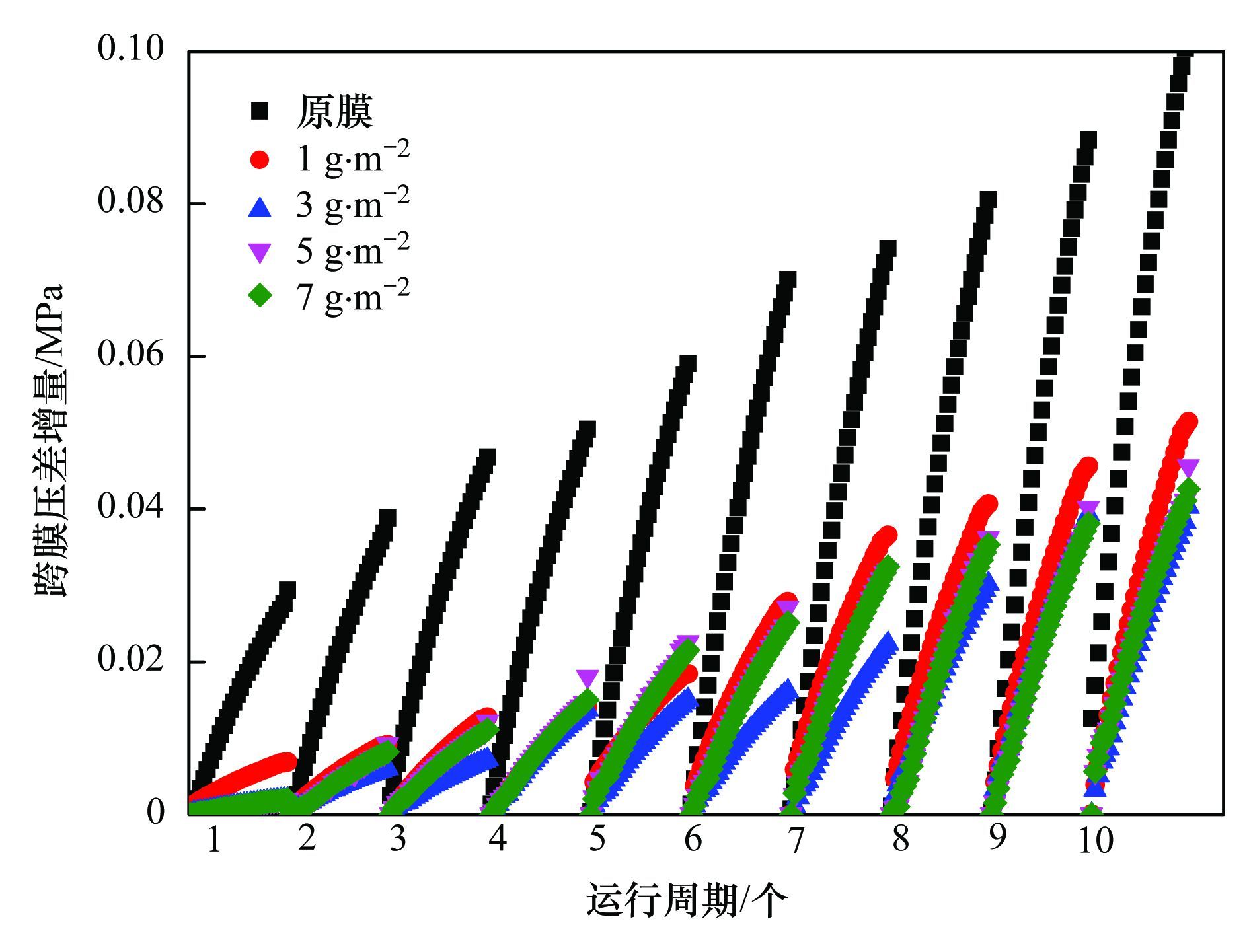 負載量對改性膜抗污染性能的影響如圖 6所示. 乙醇分散液濃度為50%,CNTs尺寸為30~50 nm,超聲時間為25 min,所選負載量分別為1、 3、 5、 7 g·m-2. 從中可以看出,不同負載量下,所有改性膜的抗污染性能均明顯好于未改性膜. 對于改性膜而言,過濾初期(前4個周期)各改性膜TMP均增長緩慢,其TMP增量均小于0.02 MPa. 隨著過濾的進行各改性膜TMP增量逐漸增加,但增長趨勢均較緩,運行至第10周期,過濾5 L水樣后,各改性膜TMP增幅并未表現(xiàn)出明顯差別. 負載量為1 g·m-2的改性膜跨膜壓差增量最大,為0.053 MPa,隨著負載量的增大,負載量為3、 5、 7 g·m-2對應(yīng)的改性膜跨膜壓差增量基本一致,約為0.047 MPa.