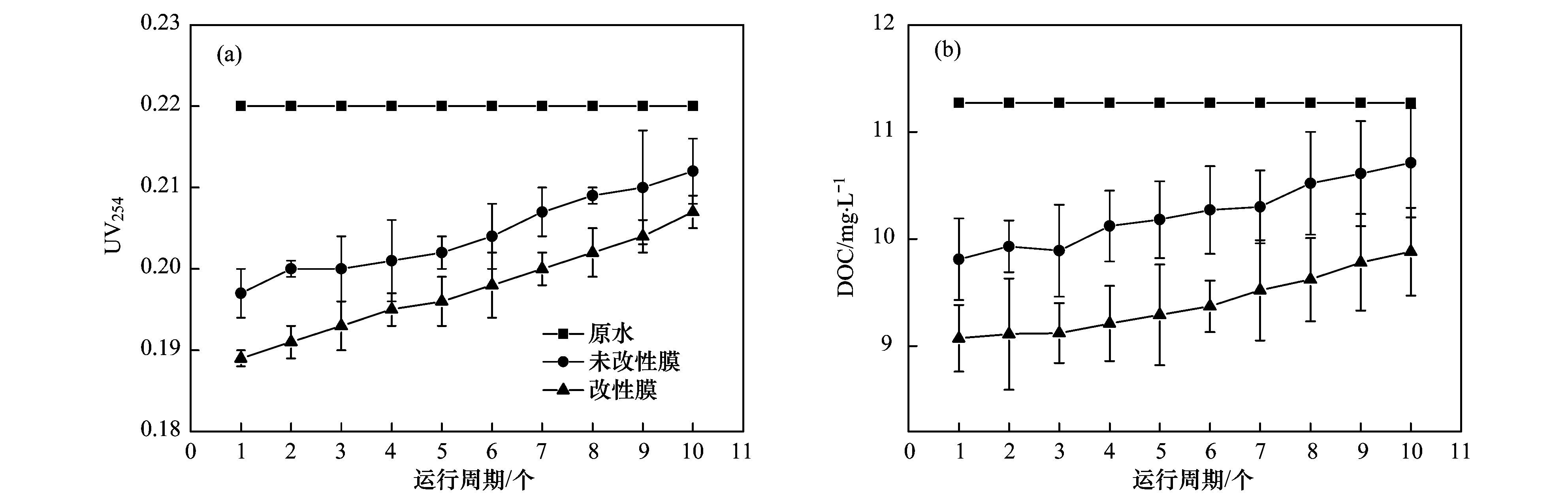 圖 8(b)為水樣經(jīng)改性膜和未改性膜過濾后出水中DOC的變化情況. 結(jié)果表明,改性膜對DOC的去除率明顯高于未改性膜. 運行初始階段,原水的DOC為11.15 mg·L-1,經(jīng)改性膜和未改性膜過濾后出水中DOC分別為9.10 mg·L-1和9.83 mg·L-1,即改性膜和未改性膜對DOC的去除率分別為18.4%和11.8%,相比于未改性膜,改性膜對DOC的去除率提高了56%. 隨著運行的進行,兩者對DOC的去除率均逐漸降低,且兩者降低趨勢較一致,出水中DOC逐漸升高,運行至第10周期,過濾5L水樣后,經(jīng)改性膜和未改性膜過濾后出水中DOC分別為9.70 mg·L-1和10.80 mg·L-1,即改性膜和未改性膜對DOC的去除率分別為13%和3.1%,較初始階段的去除率分別降低了5.4%和8.7%.