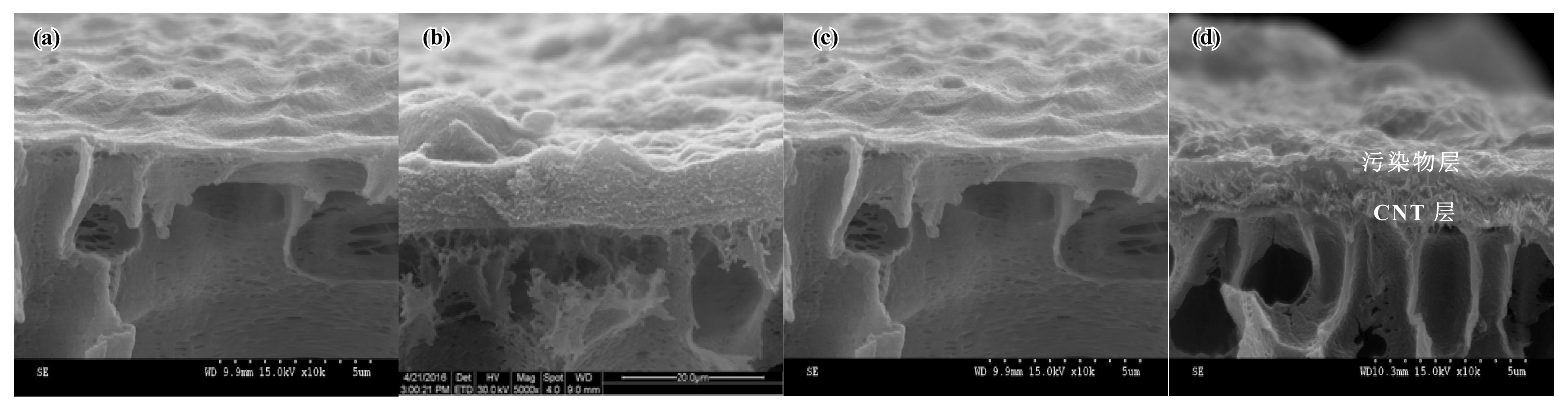 (a)原膜(×10 000); (b)CNT改性膜(×5 000); (c)過濾二級出水的原膜(×10 000); (d)過濾二級出水的CNT改性膜(×10 000)