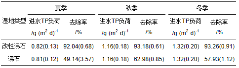 季節(jié)變化對(duì)濕地除磷效果的影響見表 6,為減輕TP負(fù)荷不同對(duì)處理效果的影響,選取沸石濕地進(jìn)水TP負(fù)荷在0.85~1.05 g·(m2·d)-1間的數(shù)值結(jié)果進(jìn)行比較發(fā)現(xiàn),相較夏季,沸石濕地在秋季的TP去除率提高了8.33%,且穩(wěn)定性更高.植物的繼續(xù)生長,泌氧能力的加強(qiáng),磷素形態(tài)轉(zhuǎn)化速率加快,濕地內(nèi)生物量不斷增加,生物膜的生長成熟是濕地除磷效果和穩(wěn)定性增強(qiáng)的主要原因.對(duì)沸石濕地進(jìn)水TP負(fù)荷在1.06~1.50 g·(m2·d)-1間的數(shù)值結(jié)果進(jìn)行秋冬季比較,冬季TP去除率較秋季降低了10.29%,微生物生長繁殖受限及填料吸附能力的下降是其除磷效果變差的主因.而改性沸石濕地始終保持在較高水平,出水濃度基本穩(wěn)定在0.5mg·L-1以下.