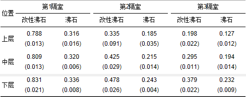 磷素截留量均呈現(xiàn)出第1隔室>第2隔室>第3隔室的規(guī)律,各隔室均呈現(xiàn)出下層>中層>上層的規(guī)律.第1隔室中吸附量較為接近,第2、3隔室上下層吸附量差距較大.改性沸石優(yōu)化的磷素吸附性能使填料在第2隔室中上層前后端吸附量差距更為明顯. Al3+取代沸石晶格中的Si4+后,既可能吸附沉淀PO43-,也可能由于生成多余負(fù)電荷強(qiáng)化對(duì)NH4+-N的吸附.與氮素相比,改性沸石對(duì)磷素的截留能力較差,第1隔室僅截留了53.50%的磷素.第1隔室中改性沸石與沸石相比,氮素和磷素平均截留量分別增加了1.70 mg·g-1和0.485 mg·g-1,說明雖然Al3+有效入替到晶格中,但其對(duì)NH4+-N的吸附優(yōu)于對(duì)PO43-的吸附,粗壯根系的導(dǎo)流作用使相同區(qū)域的改性沸石磷截留量增加5.8%.