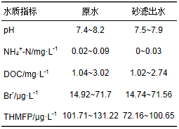 研究中原水DOC為1.04~3.02 mg·L-1,隨季節(jié)波動較大,在氯消毒過程中,水中部分有機物能夠作為前驅(qū)體被氧化生成致癌物三鹵甲烷(THMs),該水源水的三鹵甲烷生成勢(THMFP)為101.71~131.22 μg·L-1,常規(guī)處理工藝中混凝沉淀砂濾能夠去除水中部分THMs前驅(qū)物,從表 1中可以看到砂濾出水THMFP為72.16~100.65 μg·L-1,表明常規(guī)工藝出水THMFP有所降低,這是因為常規(guī)工藝能夠去除較多的疏水性有機物,而該類有機物被證明與氯反應(yīng)時具有較強的THMs生成活性,砂濾出水中THMFP含量仍然較高,在后續(xù)消毒中存在超標風(fēng)險,需對其進行進一步控制.