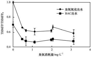圖 3為在常規(guī)工藝后利用O3-BAC深度處理工藝控制THMFP的效果,THMFP/THMFP0代表臭氧氧化工藝段及BAC處理工藝段出水中THMFP相對于常規(guī)工藝砂濾出水的剩余率.當(dāng)不投加臭氧時,BAC出水剩余率將近71%,當(dāng)臭氧消耗量從0增加到1.0 mg·L-1,臭氧氧化及BAC兩工藝段出水的剩余率分別達到61%和47%,說明臭氧的氧化促進了后續(xù)BAC對THMs前驅(qū)物的去除效果,這可能與臭氧氧化生成了更多小分子有機物如醛、酮、羧酸類物質(zhì)有關(guān).在此基礎(chǔ)上繼續(xù)增加臭氧投加量對THMFP并沒有進一步的去除.