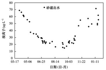 表 1為該水源原水與常規(guī)工藝出水即砂濾工藝段出水水質(zhì)指標,從中可以看出,水中氨氮含量較低,原水在0.09 mg·L-1以下,有機物及溴離子濃度變化范圍較大,水源中溴離子濃度范圍為14.92~71.7 μg·L-1,溴離子濃度隨時間和季節(jié)變化規(guī)律明顯,如圖 2所示,從3月開始,溴離子濃度開始逐漸降低,7~9月溴離子濃度達到最低,約為20.53 μg·L-1左右,之后又逐漸升高,溴離子濃度隨季節(jié)變化可能與夏季降水的稀釋作用有關(guān).