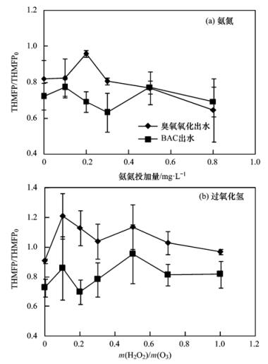 氨氮及過氧化氫投加能有效控制溴酸鹽,其可能改變臭氧與水中有機物如THMs前驅(qū)物的反應(yīng)途徑,進而影響對THMFP的去除.研究中考察了臭氧消耗量為2.0 mg·L-1時,投加氨氮或過氧化氫對O3-BAC工藝去除THMFP的效能影響,如圖 6所示.從圖 6(a)中可以看出,氨氮的投加對THMFP的去除效率并沒有顯著影響,而圖 6(b)顯示H2O2的加入對O3-BAC去除THMFP效能產(chǎn)生一些影響,隨著H2O2/O3的升高,O3-BAC對THMs前驅(qū)物的去除效果略有下降.在不投加過氧化氫時,O3-BAC處理之后THMFP剩余率為72%,而在H2O2/O3為0.5和1.0時,剩余率增加到了80%~90%.以往研究者也發(fā)現(xiàn)投加過氧化氫后的THMFP比單獨臭氧氧化出水THMFP高20%,有研究者將其歸因于過氧化氫加入導(dǎo)致·OH生成,但·OH在改變NOM結(jié)構(gòu)的過程中具有非選擇性,它更容易與有機物反應(yīng)生成酚、酮等官能團,而這些物質(zhì)更容易與氯反應(yīng)生成THMs.在反應(yīng)進行過程中,體系中存在剩余過氧化氫,其能夠與羥基自由基發(fā)生反應(yīng),進而也可能減少THMs前驅(qū)物的氧化效率,使得該工藝對THMFP去除效率有所降低.也有研究者對投加H2O2前后水中有機物不同組分如疏水中性物質(zhì)、疏水堿性物質(zhì)、疏水性酸、弱疏水性酸及親水性物質(zhì)生成THMs的活性進行了比較,發(fā)現(xiàn)過氧化氫的加入削弱了臭氧對親水物質(zhì)及疏水酸性物質(zhì)的去除效果,該類物質(zhì)中存在較多的THMs前驅(qū)物,從而導(dǎo)致出水的THMFP有所升高.