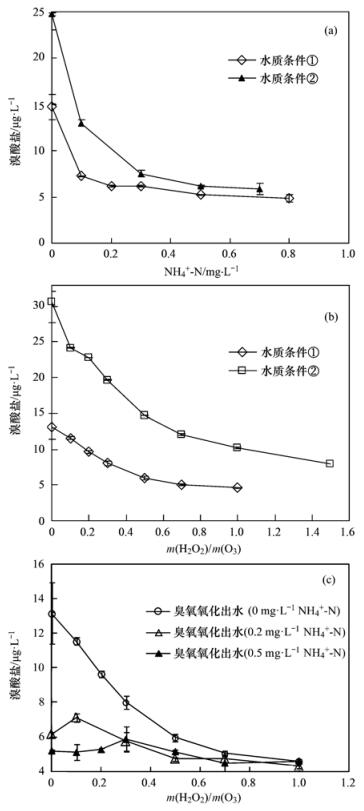 從圖 5(b)中可以看出,不同水質(zhì)條件下,將溴酸鹽控制在標準以內(nèi)所需的H2O2量并不相同,在條件①下,H2O2/O3在0.2時,即可將溴酸鹽降低至10 μg·L-1;而在條件②下,H2O2/O3需要增加到1.0才能達到相應(yīng)效果,從而可以看出,控制溴酸鹽的H2O2最佳投量與原水水質(zhì)有較大關(guān)系.本研究中考察了不同氨氮條件對H2O2控制溴酸鹽效果,如圖 5(c)所示.從中可以看出,與不投加氨氮相比,在0.20 mg·L-1和0.50 mg·L-1氨氮投加量下,H2O2對溴酸鹽的控制效果有所不同,在不投加氨氮情況下,溴酸鹽生成量隨H2O2/O3的增大而減小,而投加0.20 mg·L-1和0.50 mg·L-1氨氮時,溴酸鹽生成量均呈現(xiàn)出了先增加后降低的趨勢.在0.20 mg·L-1氨氮投加量下,在H2O2/O3為0.1時生成更多溴酸鹽,而0.50 mg·L-1氨氮條件下,H2O2/O3為0~0.3時生成更多,隨后均逐漸降低,這說明,氨氮含量不同,會導(dǎo)致H2O2投加控制溴酸鹽的效果產(chǎn)生差異.以往研究在對黃河水進行溴酸鹽控制時,也發(fā)現(xiàn)隨著H2O2/O3逐漸升高,溴酸鹽生成量先增加后減少,這有可能與水源水的不同水質(zhì)因素有關(guān),有機物、溴離子以及氨氮濃度等不同可能導(dǎo)致臭氧分解與·OH生成速率發(fā)生變化,當(dāng)臭氧與·OH共同氧化溴離子效率有所增加,引起溴酸鹽生成量略有升高.