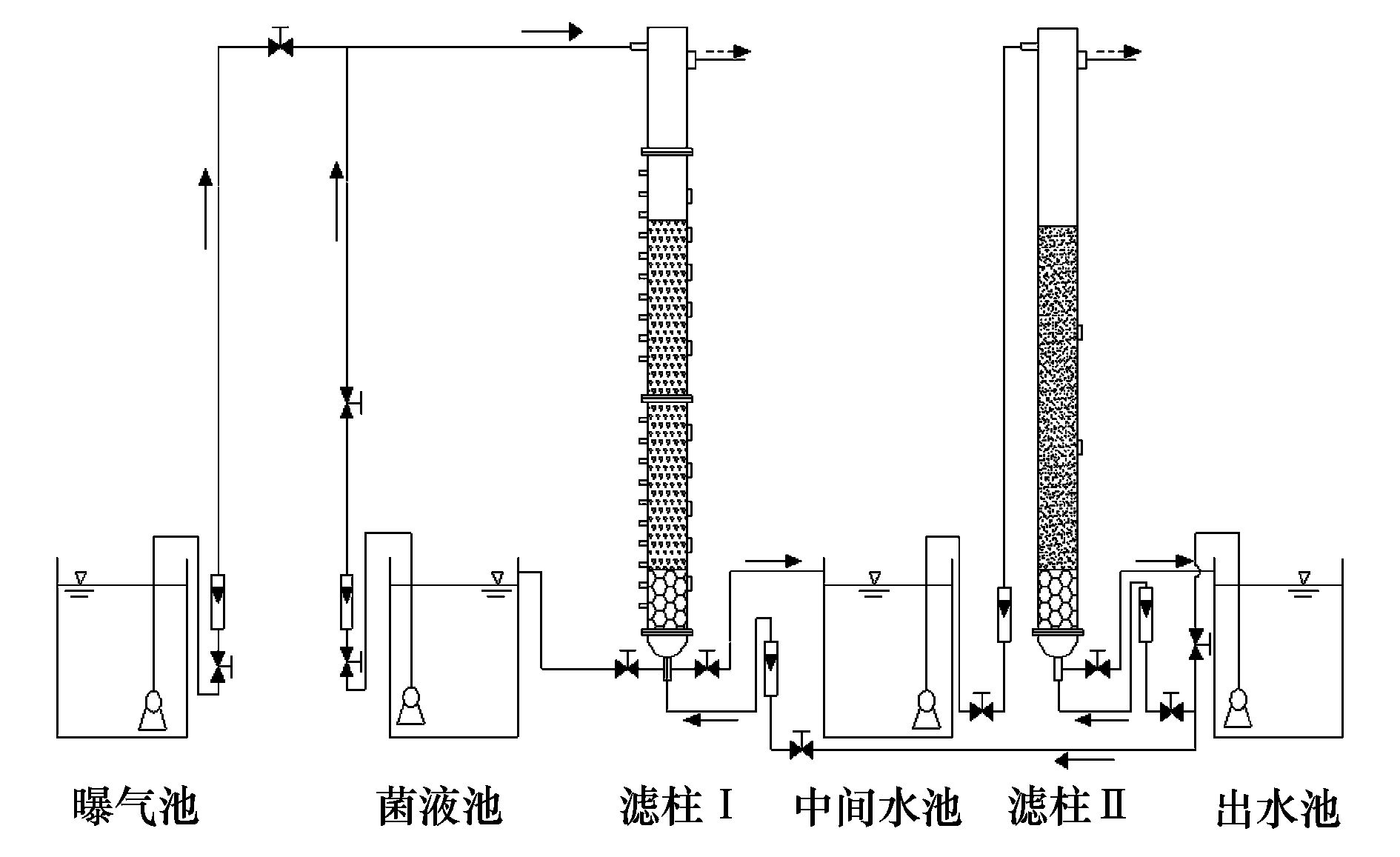 試驗裝置見圖 1,包括曝氣池、 菌液池、 兩個濾柱、 中間水池與出水池.濾柱Ⅰ、 Ⅱ直徑80 mm,自上至下依次添裝1 300~1 500 mm高濾料與80~100 mm高鵝卵石與錳砂混合承托料,濾柱Ⅰ、 Ⅱ濾料分別為碳化稻殼顆粒(CRH600,20~120目,自制[4])與載銀活性炭顆粒(5~10 目,購自東莞市樟木頭楓林活性炭有限公司),濾柱Ⅱ用于去除濾柱Ⅰ出水的殘余鐵錳與生物菌.試驗水溫通過制冷機控制在17℃(此溫度設定主要考慮鐵錳氧化菌的活性).