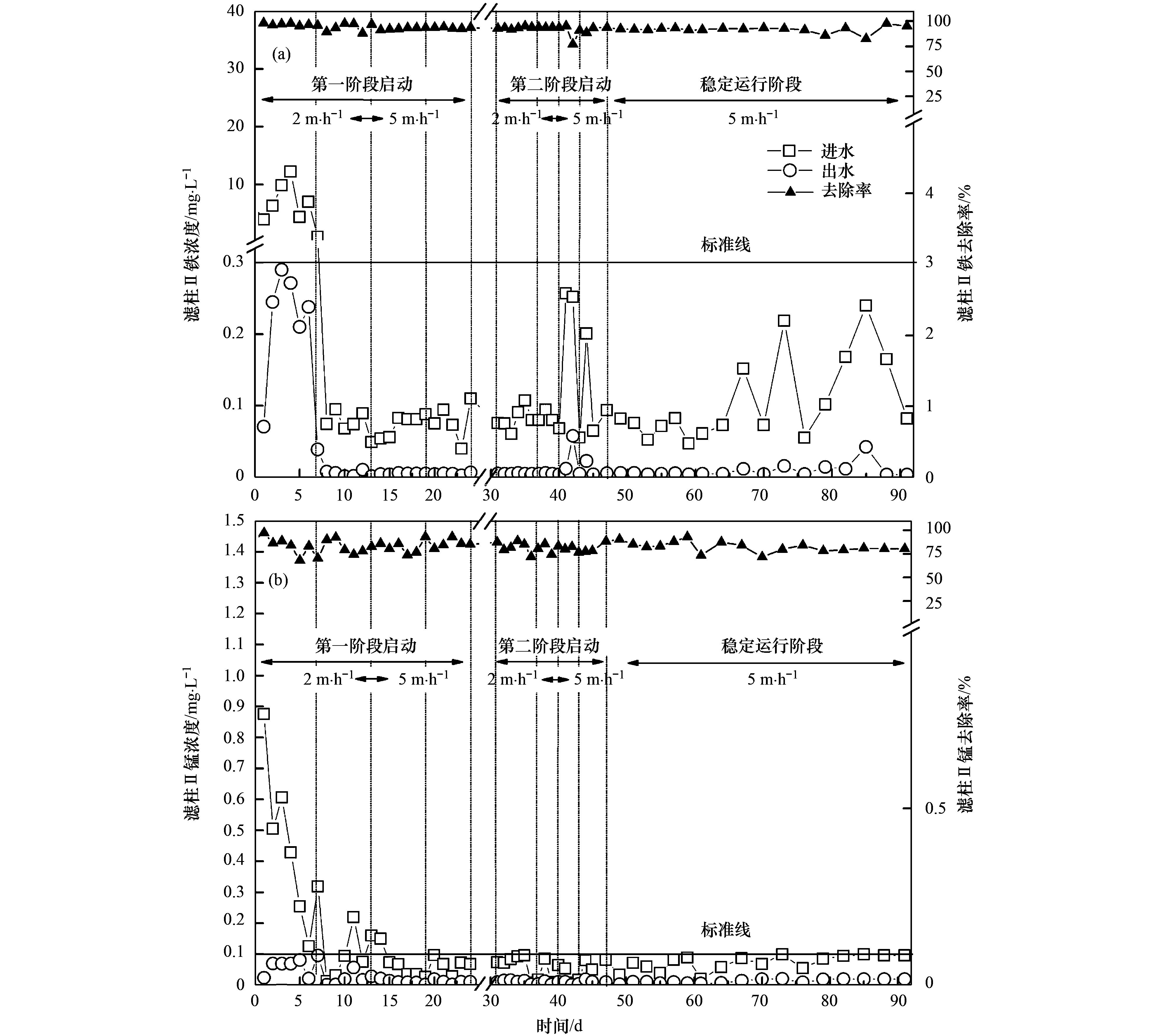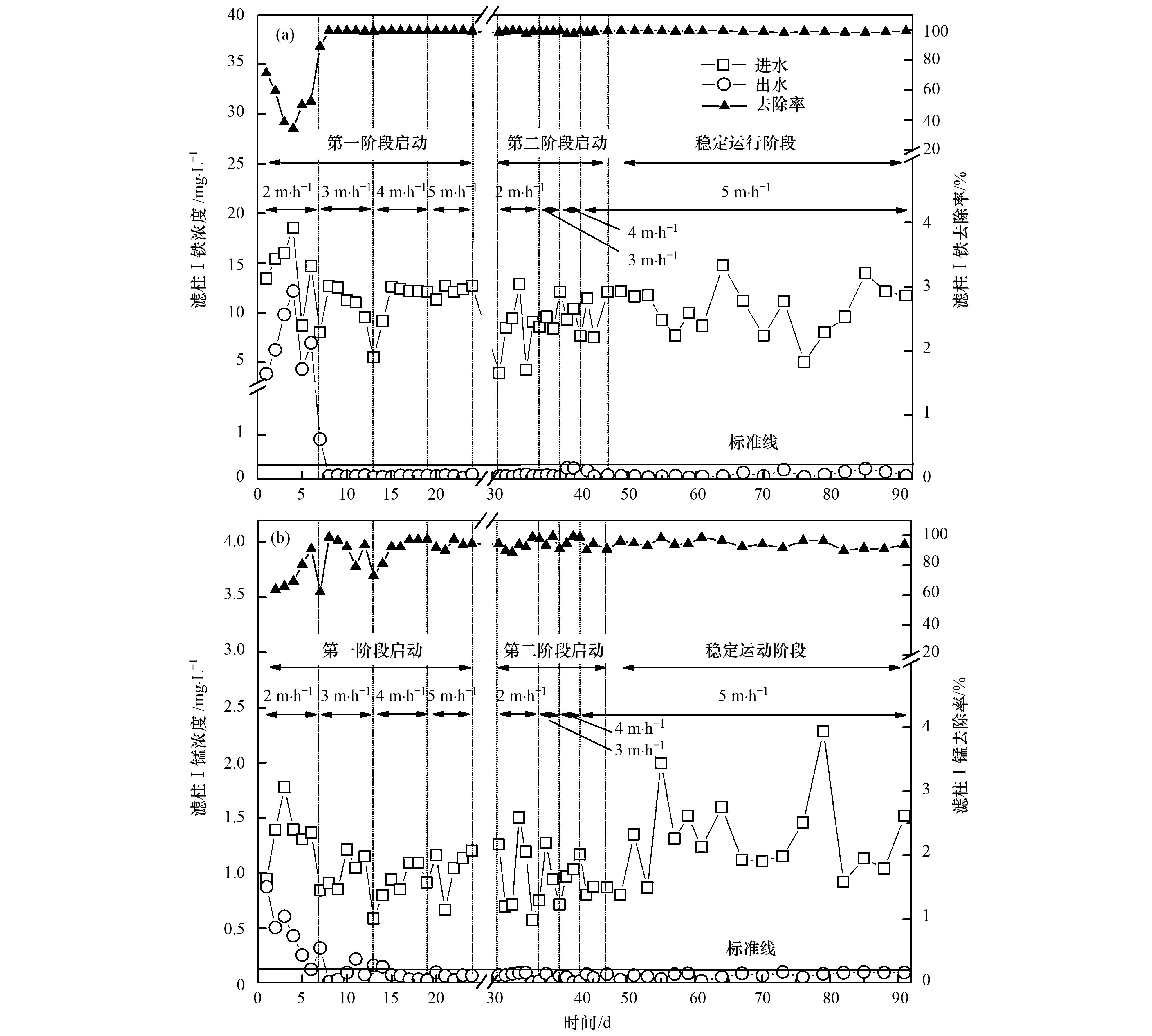 濾柱Ⅰ兩次啟動運行15 d后,不斷提高濾速至5m·h-1,且停滯6 d再次低濾速啟動,出水Fe2+、 Mn2+濃度不受濾速改變、 停滯工況的影響,滿足《生活飲用水衛(wèi)生標準》(GB 5749-2006),且去除率均在90%以上,表明該試驗在低濾速條件下建立了穩(wěn)定的鐵錳優(yōu)勢菌種的微生態(tài)系統(tǒng),系統(tǒng)抗負荷、 抗沖擊能力較強.