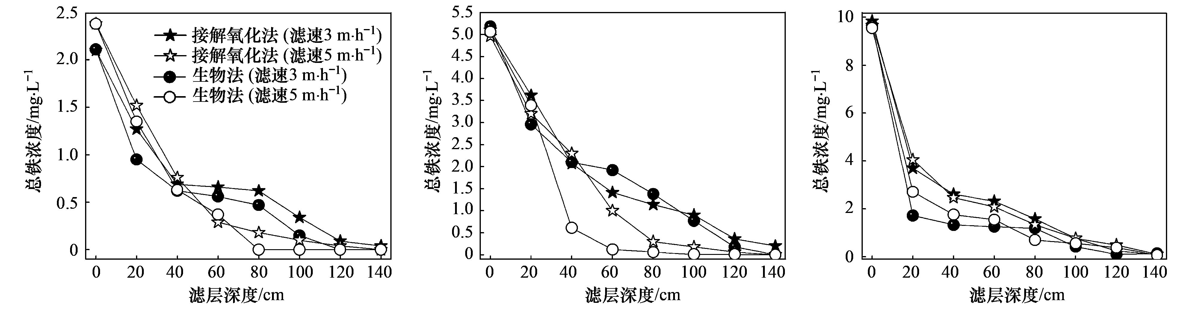 待濾柱Ⅰ啟動成功后,基于接觸氧化法與生物法,對比分析不同濾速條件下濾柱Ⅰ每d各濾層沿程(自上而下20、 40、 60、 80、 100、 120、 140 cm)出水的總鐵、 Fe2+濃度及反應速率,考察除鐵機制.設定反沖洗強度、 時間、 周期分別為10 L·(s·m2)-1、 2 min、 2 d,進水總鐵濃度分別為2、 5、 10 mg·L-1,濾速分別為3m·h-1、 5m·h-1,濾速固定時,濾柱Ⅰ在每個進水總鐵濃度下運行7 d.