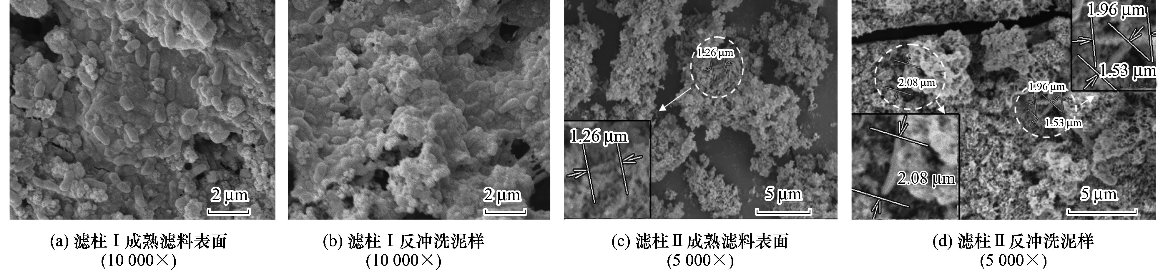 圖 8 濾柱Ⅰ、 濾柱Ⅱ 濾料與反沖洗泥樣的微生物SEM圖