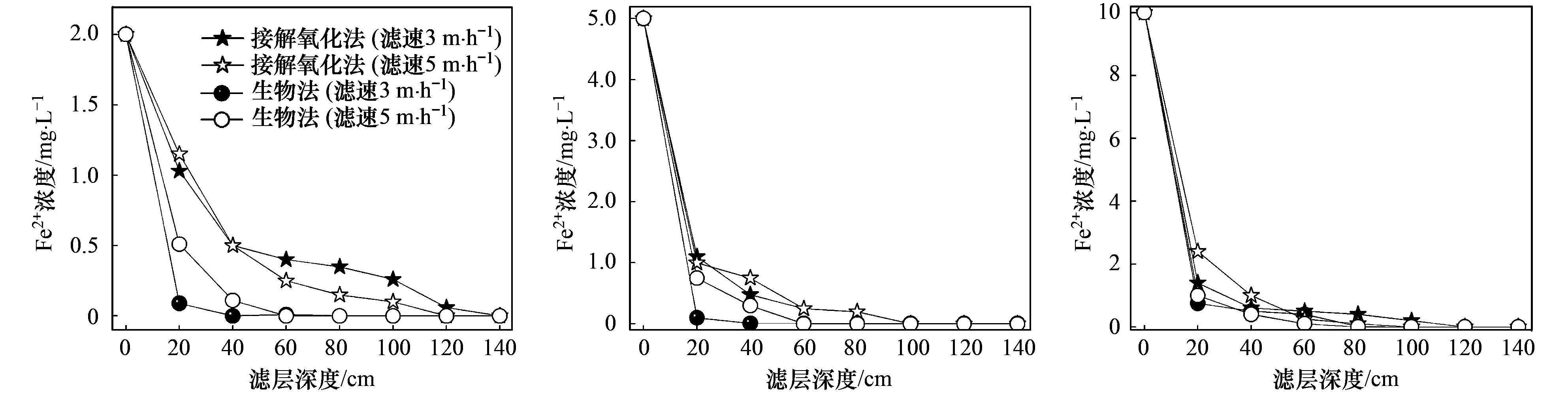 針對濾柱Ⅰ不同濾速、 進水總鐵濃度的試驗結果,生物法除總鐵、 Fe2+能力均高于接觸氧化法,受濾速的影響較大,且進水總鐵濃度越低,濾速影響越顯著.由圖 6可知,接觸氧化法對于總鐵的去除效果相差不大,而在生物法中,濾層上部20 cm范圍內低濾速對應的濾柱沿程出水總鐵濃度略低,濾層中部(40~100 cm)高濾速對應的濾柱沿程出水總鐵濃度略低,除總鐵能力差別明顯.由圖 7可知,濾層上部40 cm范圍內,不同濾速時接觸氧化法除Fe2+效果差別不大,生物法除Fe2+效果隨著濾速增加略有下降; 對于相同濾層深度,高濾速出水Fe2+濃度較低濾速的高,表明提高濾速后生物法需更大的濾層深度氧化Fe2+.當進水總鐵濃度大于5 mg·L-1時,濾層深度大于60 cm后,兩種方法出水Fe2+濃度幾乎不受濾速影響且均至去除極限,表明Fe2+去除主要集中于濾層上部60 cm范圍內.