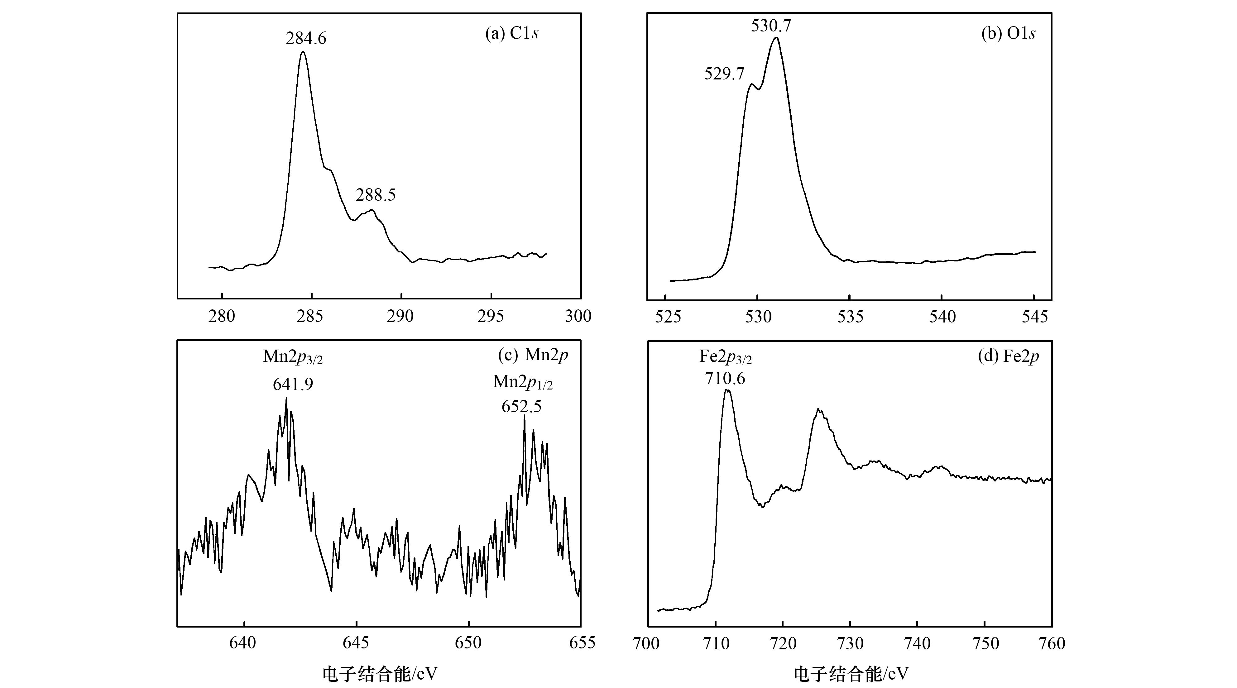 圖 10分別為C1s、 O1s、 Mn2p、 Fe2p的XPS光譜圖,通過找到峰值處所對應的橫坐標結合能(binding energy)來判定是否存在某種元素及該元素的存在形式.從圖 10(a)可知,C1s的出峰位置在284.6 eV及288.5 eV處,分別表明樣品中存在C—C、 C—H鍵與酯類官能團,因酯類化合物為微生物生長所需且為微生物氧化產物的重要組成部分,故表明樣品中存在微生物.從圖 10(b)可知,O1s的出峰位置在529.7 eV及530.7 eV處,分別表明樣品中存在晶格氧O2-、 醇羥基OH-,O2-的出現通常為氧與金屬元素的結合,進而證明了鐵錳氧化物的存在,后者則表明樣品表面存在OH-吸附情況.從圖 10(c)可知,Mn2p3/2峰值出現在641.9 eV.錳在反應器中一般以多種價態(tài)形式存在,通常用MnOx來表示錳的化學結構: 當x為1、 2時,錳的化合價分別為+2、+4,對應峰值在640.6eV、 642.2eV處; 錳還可以+3價存在,如MnOOH,出峰位置為641.5eV.因本研究的Mn2p3/2結合能為641.9eV在641.5 eV與642.2 eV之間,故認為MnOx中Mn的平均價態(tài)在+3與+4之間.從圖 10(d)可知,Fe2p3/2的出峰位置在711.6 eV處,該處是鐵羥基氧化物的特征峰,該氧化物一般存在于針鐵礦或水鐵礦中; Søgaard等研究表明針鐵礦或水鐵礦峰值分別為711.9 eV與711.6 eV,可確定樣品表面存在的羥基氧化物是無定型的水鐵礦,這與Katsoyiannis等的生物除鐵研究結果一致.