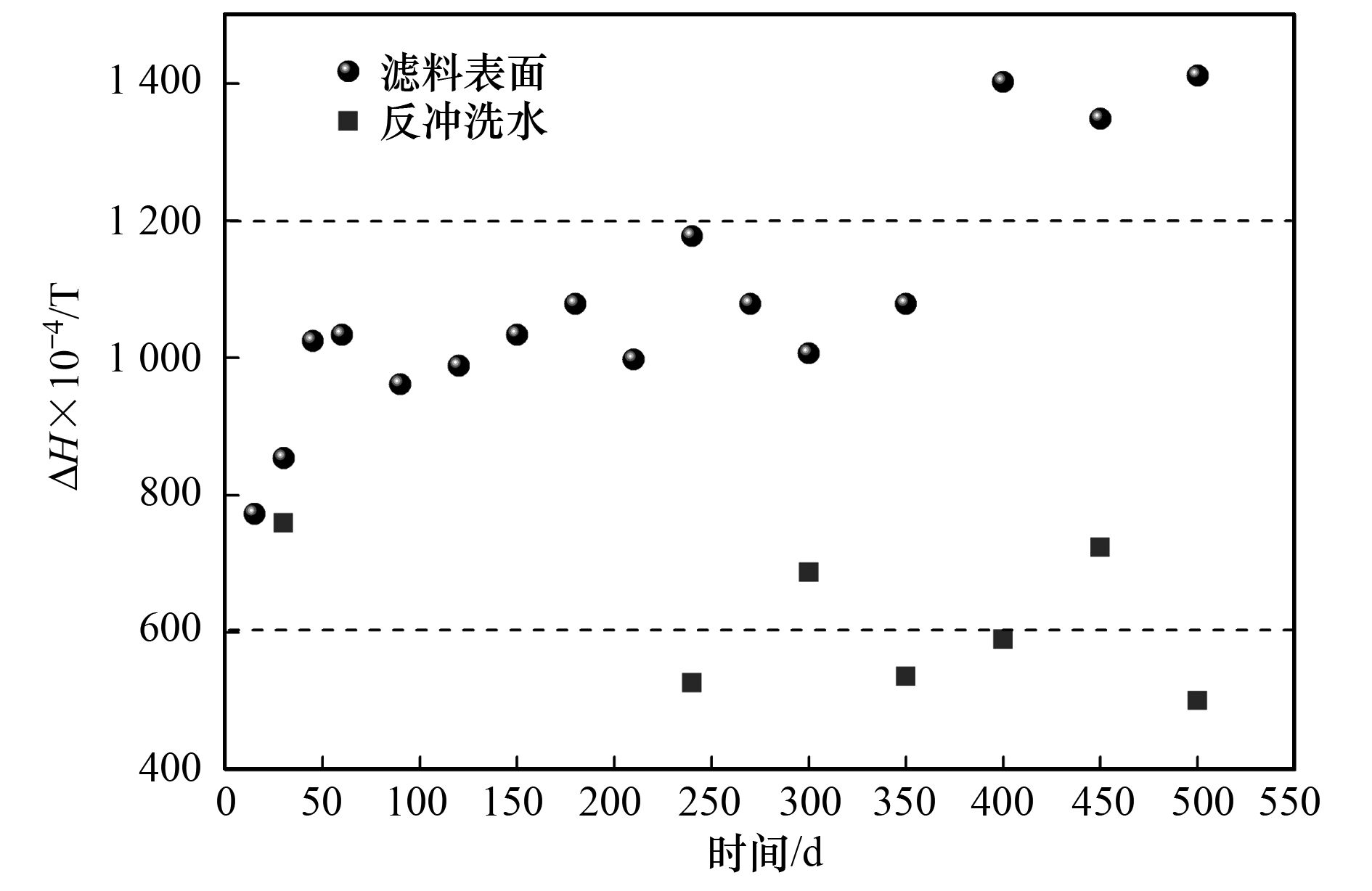 由圖 12可知,隨著運行時間的延長,濾料表面水鈉錳礦的ΔH值也隨之增加,250 d內,ΔH值增加快速,當400 d后,ΔH從(600~1 200)×10-4 T范圍變化升至1 200×10-4 T以上,表明400 d后除錳機制從生物作用轉變?yōu)槲锘饔,物化作用主要為反應速度極快的自催化氧化.反沖洗水中水鈉錳礦的ΔH值圍繞600×10-4 T上下波動,表明生物除錳存在于整個過濾過程,此處的水鈉錳礦主要是生物作用形成,來自濾料生物膜表面,易被水沖刷.試驗過程中濾柱膨脹幅度低,表明物化形成的水鈉錳礦緊固濾料表面,極少被沖刷.