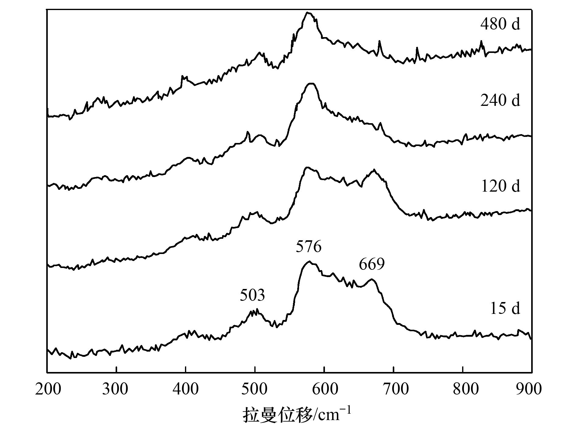 經歷不同運行時間的濾料的Raman光譜分析見圖 11.從中可知,濾料成熟初期,Raman光譜主要有 3個峰,Raman 位移分別為503、 576和669 cm-1,表明錳氧化物為水鈉錳礦(birnessite)型,運行時間越長,水鈉錳礦峰值強度減弱,此時水鈉錳礦的結晶度很低或呈無定形相.