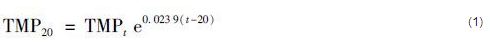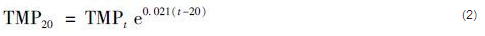 由于試驗時間較長且裝置位于室外環(huán)境,水溫有一定幅度波動,對TMP數(shù)值產(chǎn)生影響,試驗采用水溫修正后的TMP增長曲線進行膜污染分析,TMP水溫校正采用式(1) 和(2) :