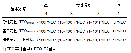由于水體中污染物種類繁多,每種物質(zhì)引起的毒性不同,因此選用多組生物毒性檢測(cè)方法進(jìn)行評(píng)價(jià)更有意義. Xu等建立了基于多種生物毒性檢測(cè)的水質(zhì)安全評(píng)價(jià)方法,本文采用該方法對(duì)水樣進(jìn)行評(píng)價(jià),具體方法如下:通過(guò)對(duì)傳統(tǒng)風(fēng)險(xiǎn)外推法進(jìn)行改進(jìn),提出毒性的4個(gè)得分指標(biāo): 1、2、3、4;數(shù)字越大,毒性越強(qiáng).根據(jù)引起顯著毒性效應(yīng)的水樣最低濃度將毒性測(cè)試結(jié)果轉(zhuǎn)化為毒性得分,在此基礎(chǔ)上,對(duì)水樣的3種毒性得分進(jìn)行匯總,提出水質(zhì)安全分級(jí)指標(biāo)A、B、C、D,水質(zhì)安全性依次降低,由毒性測(cè)試結(jié)果中最差的得分值確定水質(zhì)的安全級(jí)別.將各生物毒性結(jié)果用當(dāng)量表示,樣品的毒性當(dāng)量與陽(yáng)性對(duì)照的可預(yù)測(cè)無(wú)效應(yīng)濃度(PNEC) 進(jìn)行對(duì)比,參照水質(zhì)分析標(biāo)準(zhǔn)確定樣品的得分如表 1所示.在本研究中,陽(yáng)性對(duì)照的PNEC值基于物種敏感性分布(SSDs).