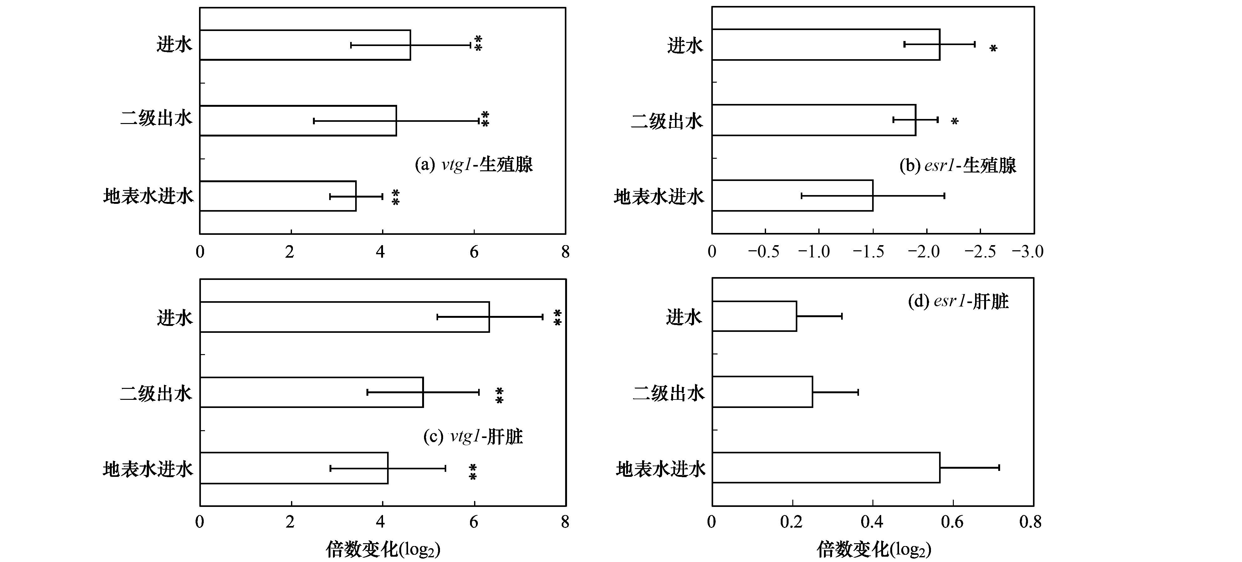 圖 6 暴露在進(jìn)水、二級(jí)出水和地表水進(jìn)水中的雄性斑馬魚(yú)生殖腺和肝臟的目的基因(esr1和vtg1) 的變化