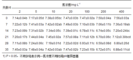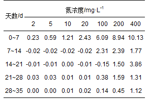 不同氮濃度污水氨氮濃度隨粉綠狐尾藻處理時間增長而逐漸降低(表 6).粉綠狐尾藻處理7d,低氮濃度污水氨氮去除率為92.4%~98.8%、接近100%,高氮濃度污水氨氮去除率只有33.5%~69.2%、平均為52.9%;35 d時,氮濃度100 mg·L-1、200 mg·L-1的污水氨氮去除率分別為99.6%和99.3%、近100%,氮濃度400 mg·L-1的污水氨氮的去除率僅為60.2%.粉綠狐尾藻對不同氮濃度污水氨氮的去除速率隨時間呈下降趨勢(表 7).在0~7 d,粉綠狐尾藻對氨氮的去除速率最高且隨污水氮和氨氮濃度升高而增加;氮濃度100 mg·L-1、200 mg·L-1的污水分別在第2周和第4周后氨氮的去除速率顯著下降,而氮濃度400 mg·L-1的污水在28~35 d仍有相對較高的氨氮去除速率.由此說明,對氮濃度不高于20 mg·L-1的低氮濃度污水,粉綠狐尾藻處理7 d就能夠去除90%以上氨氮且去除速率顯著下降;對氮濃度100 mg·L-1、200 mg·L-1的污水,粉綠狐尾藻分別處理2和4周能夠去除氨氮90%以上且去除速率顯著下降;但對氮濃度400 mg·L-1的污水,處理5周只能去除60%的氨氮.