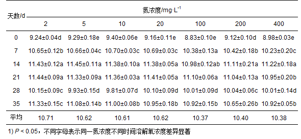 表 11 粉綠狐尾藻處理對不同氮濃度污水溶解氧濃度影響1)/mg·L-1