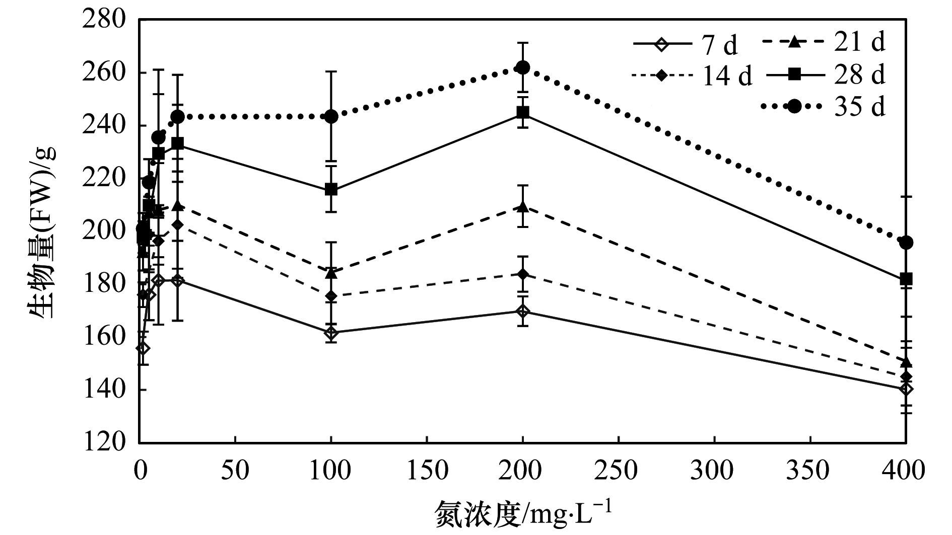 粉綠狐尾藻的生物量隨污水氮濃度的變化因時間而不同(圖 1).在21 d以前,粉綠狐尾藻的生物量隨氮濃度升高到20 mg·L-1達(dá)到最大,氮濃度100~400 mg·L-1則有所下降;21~35 d時,粉綠狐尾藻的生物量隨氮濃度升高到200 mg·L-1達(dá)到最大,氮濃度400 mg·L-1則有所下降.粉綠狐尾藻生物量的增長率(表 2),在14 d以前,以低氮濃度2~20 mg·L-1污水較高;14~21 d,處理間粉綠狐尾藻生物量增長率沒有明顯規(guī)律;21~35 d的增長率以高氮濃度100~400 mg·L-1污水較高,約為低氮濃度污水的1.5~2倍,且以200 mg·L-1最高.由此說明,前3周在氮濃度不高于20 mg·L-1即低氮濃度污水粉綠狐尾藻生長最好,4~5周則以高氮濃度200 mg·L-1的污水生長最好.低氮濃度處理試驗(yàn)初期,底泥可能能夠根據(jù)粉綠狐尾藻生長需要向水體供給氮,后期底泥氮的釋放受到抑制;試驗(yàn)初期高氮濃度處理抑制粉綠狐尾藻生長,隨后氮濃度降低,生長加快,處理更高氮濃度污水可能需要更多時間.