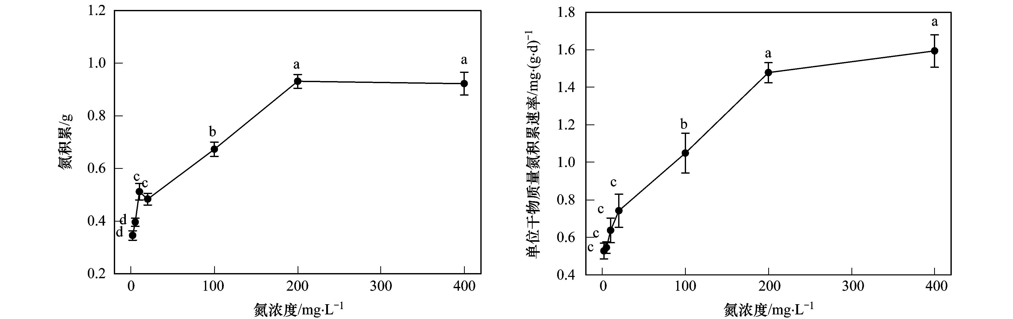 圖 2 不同氮濃度污水粉綠狐尾藻氮積累量和單位干物質(zhì)量氮積累速率