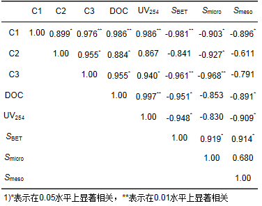 表 4 DOC、UV254、熒光組分的Fmax與活性炭表面孔結(jié)構(gòu)的相關(guān)系數(shù)矩陣