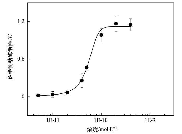 以DMSO為溶劑配置一系列E2標(biāo)液,按上述方法測(cè)定β-半乳糖苷酶誘導(dǎo)活性值,得出E2的劑量-活性效應(yīng)關(guān)系如圖 2所示.從中可以得出E2的EC50為6.73×10-11 mol ·L-1,與馬軍等[15]的研究結(jié)果 (5.95×10-11 mol ·L-1) 具有一致性,說(shuō)明了該方法的可行性.