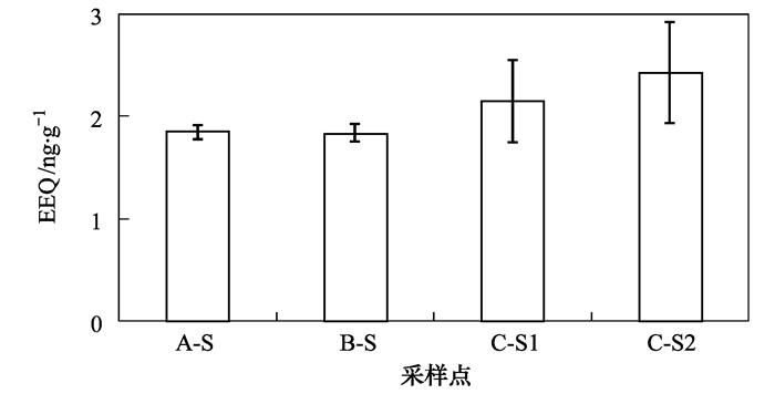 對(duì)比3個(gè)污水處理廠(chǎng)的主要工藝發(fā)現(xiàn),雌激素活性的降低主要依賴(lài)污水處理的氧化溝工藝、A2/O工藝和A2/O+MBR工藝.經(jīng)過(guò)這些工藝處理之后,EEQ分別降低71.10%、74.07%和75.54%.另外,3個(gè)污水處理廠(chǎng)出水的氨氮濃度均低于5 mg ·L-1,達(dá)到一級(jí)A排放標(biāo)準(zhǔn),總磷的濃度低于1 mg ·L-1,達(dá)到一級(jí)B排放標(biāo)準(zhǔn).這說(shuō)明3個(gè)污水廠(chǎng)的生物處理單元具有良好的脫氮除磷效果和較好的菌落結(jié)構(gòu).而固醇類(lèi)雌激素如E1、E2、E3和EE2主要是通過(guò)氨氧細(xì)菌共代謝作用和異養(yǎng)菌作用得到降解,當(dāng)污水處理過(guò)程中具有良好的硝化作用時(shí),這些物質(zhì)可得到很好地去除.例如,Khunjar等指出氨氧化菌將EE2降解為某中間產(chǎn)物如羥基EE2,而異養(yǎng)菌可將EE2的中間產(chǎn)物繼續(xù)降解為更簡(jiǎn)單的結(jié)構(gòu)甚至碳化.同時(shí),本實(shí)驗(yàn)檢測(cè)到3個(gè)污水處理廠(chǎng)活性污泥的雌激素活性,如圖 4所示.氧化溝污泥、A2/O工藝好氧池污泥、A2/O+MBR工藝的好氧池污泥和MBR膜池污泥的EEQ分別為1.84、1.85、2.16、2.43 ng ·g-1.物質(zhì)的lgkow值決定了其與污泥的吸附能力,當(dāng)化合物的lgkow介于2.5~4.0時(shí)表現(xiàn)出中度的吸附能力;大于4.0時(shí),表現(xiàn)出高的吸附能力.而水環(huán)境中主要的雌激素物質(zhì)如E1、E2、E3和EE2的lgkow分別為3.43、3.94、2.81和4.15.因此,活性污泥可通過(guò)吸附作用去除部分的雌激素活性.