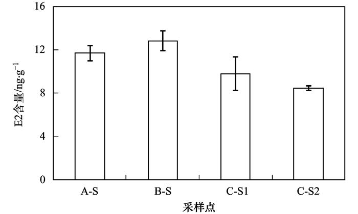 生物處理階段對(duì)E2的去除起著主導(dǎo)作用.氧化溝工藝、A2/O工藝和A2/O+MBR對(duì)E2的去除率分別為75.88%、77.84和80.72%. B污水處理廠(chǎng)對(duì)E2的去除效果稍高于A(yíng)污水廠(chǎng),這可能是由于E2在厭氧、缺氧和好氧條件下均可以被微生物降解,而A2/O工藝具有延長(zhǎng)生物處理作用的特點(diǎn).另外,良好的硝化過(guò)程有利于雌激素的去除,A2/O工藝的脫氮除磷效果高于氧化溝工藝. C污水廠(chǎng)二級(jí)出水經(jīng)MBR工藝處理后,E2的濃度降低37.16%,這可能是MBR單元具有良好的泥水分離效果,使污泥濃度增大,微生物活性增強(qiáng),強(qiáng)化了有機(jī)物的去除.由圖 5可知,加氯消毒對(duì)E2的去除效果并不明顯.加氯消毒的效果與消毒劑量有關(guān),而市政污水存在較多消毒副產(chǎn)物的前驅(qū)物如腐殖質(zhì)、富里酸和腐殖酸等影響加氯消毒對(duì)E2的去除.此外,A、B和C污水處理廠(chǎng)活性污泥中E2含量分別為11.70、12.84、9.8和8.45 ng ·g-1,如圖 6所示.如前所述,E2具有一定的親脂性,容易被污泥吸附.雌激素物質(zhì)被污泥吸附之后,通過(guò)污泥回流進(jìn)一步實(shí)現(xiàn)脫附和降解,但最終通過(guò)剩余污泥帶走的雌激素總量不超過(guò)進(jìn)水的5%.因此,污泥對(duì)E2的去除效果是微弱的.