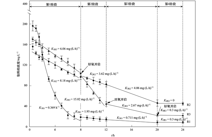 由圖 5可見,在染料和污泥混合后的一段時(shí)間內(nèi),污泥的生物吸附作用依然明顯,在生物吸附和生物降解共同作用下,在前1.5 h內(nèi) (即第一階段的前1.5 h) NB染料由實(shí)驗(yàn)開始時(shí)候的400 mg ·L-1迅速降低,在該時(shí)間段好氧條件下NB染料去除率最低,厭氧/好氧條件次之 (實(shí)際處于厭氧狀態(tài)),厭氧條件下最高;在1.5~8 h之間 (依然屬于第一階段;可以認(rèn)為從該階段開始,染料濃度的降低是通過生物降解作用實(shí)現(xiàn)的),NB染料在好氧條件下降解速率最高 (好氧條件下反應(yīng)器對染料降解符合一級反應(yīng)動力學(xué),速率常數(shù)K1R1=0.369 h-1,R2=0.968),厭氧/好氧交替次之[厭氧/好氧交替反應(yīng)器在該時(shí)段實(shí)際處于厭氧狀態(tài),微生物對染料降解符合零級反應(yīng)動力學(xué),速率常數(shù)K1R2=8.18 mg ·(L ·h)-1,R2=0.989],厭氧反應(yīng)器最低[厭氧反應(yīng)器對染料降解符合零級反應(yīng)動力學(xué),速率常數(shù)K1R3=6.06 mg ·(L ·h)-1,R2=0.990].在8~12 h之間 (即第二階段),厭氧/好氧交替反應(yīng)器開始曝氣,該反應(yīng)器中NB染料降解率最高,厭氧反應(yīng)器次之,好氧反應(yīng)器最低[在此階段,3種反應(yīng)器對染料降解均符合零級反應(yīng)動力學(xué),速率常數(shù)分別為K2R3=15.02 mg ·(L ·h)-1,R2=0.969;K2R2=3.62 mg ·(L ·h)-1,R2=0.993;K2R1=1.15 mg ·(L ·h)-1,R2=0.979].在12~20 h階段 (即第三階段),厭氧和好氧條件下NB染料降解速率變化不大,而厭氧/好氧交替反應(yīng)器重新進(jìn)入到厭氧狀態(tài),染料降解速率下降明顯.在20~24 h階段 (即第四階段),3種反應(yīng)器中染料的降解速率均較前一階段降低,染料的生物降解作用基本停滯.